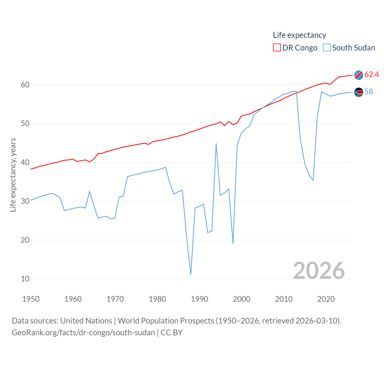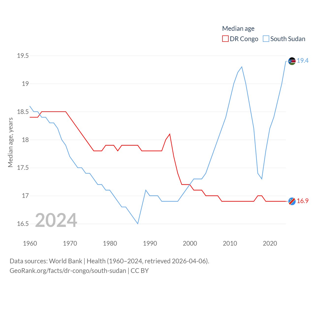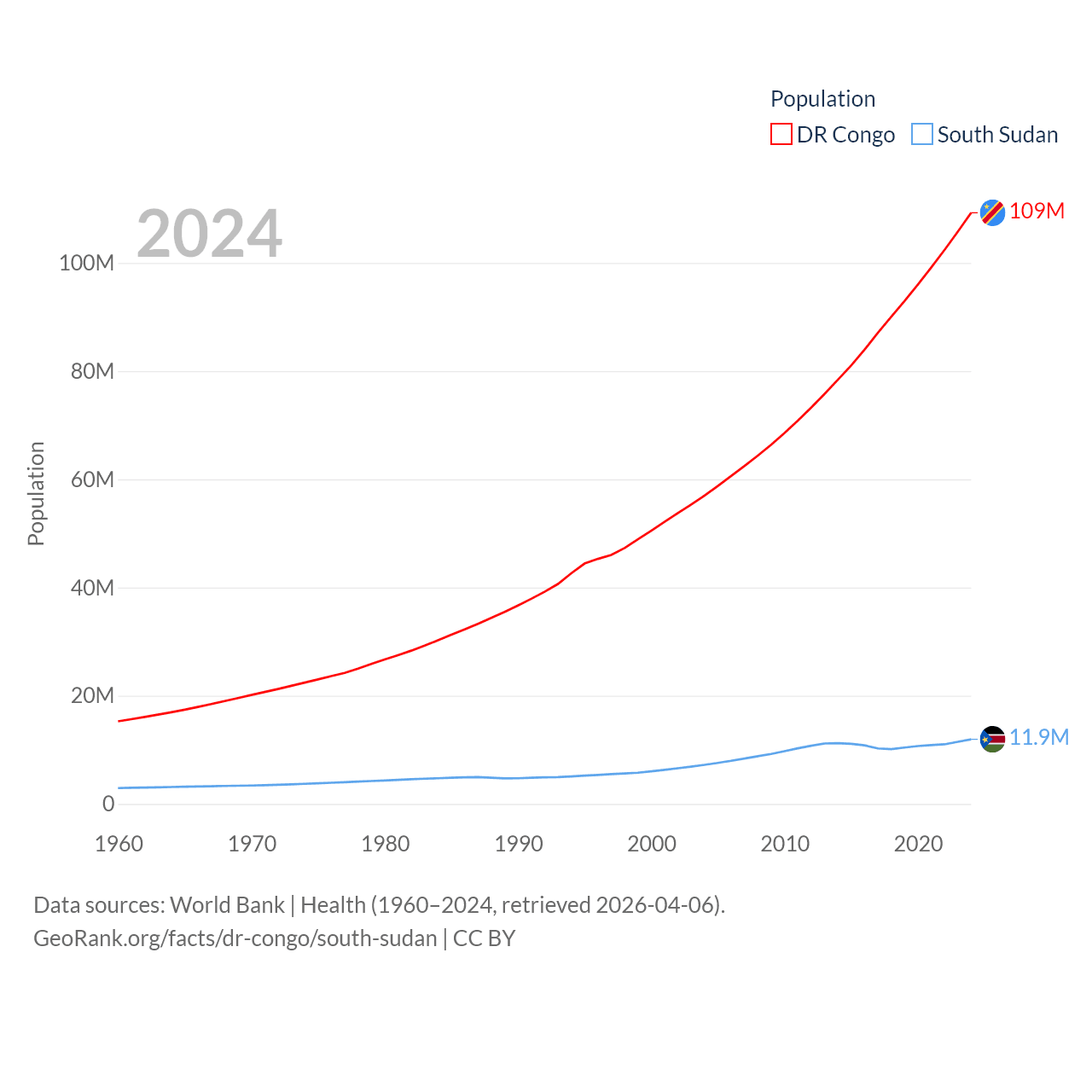 The DR Congo has a population of 109M (ranked 15/197), compared with 11.9M in South Sudan (ranked 81/197). The DR Congo's land area is 875,313 sq mi versus 243,990 sq mi for South Sudan (ranked 11th vs. 41st).