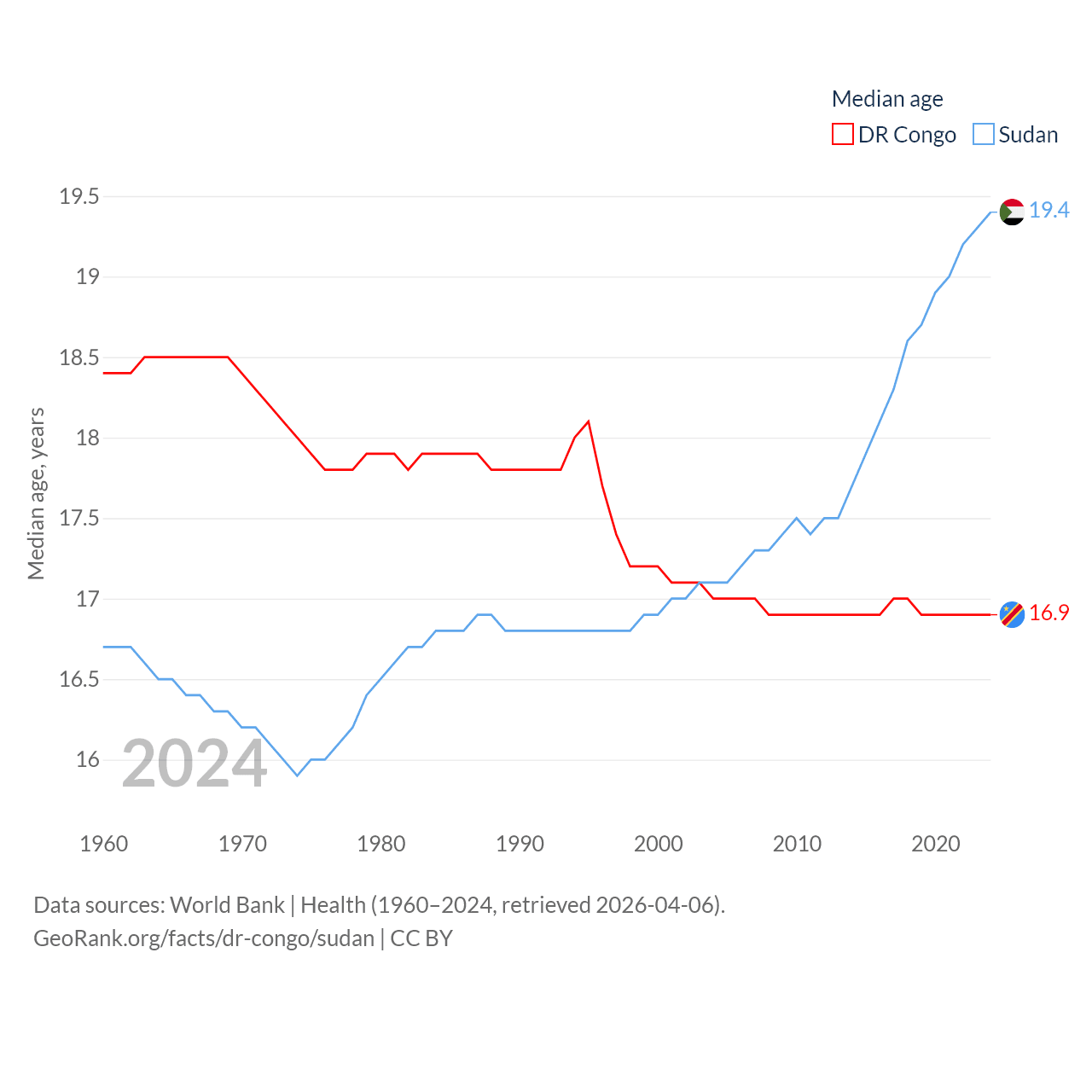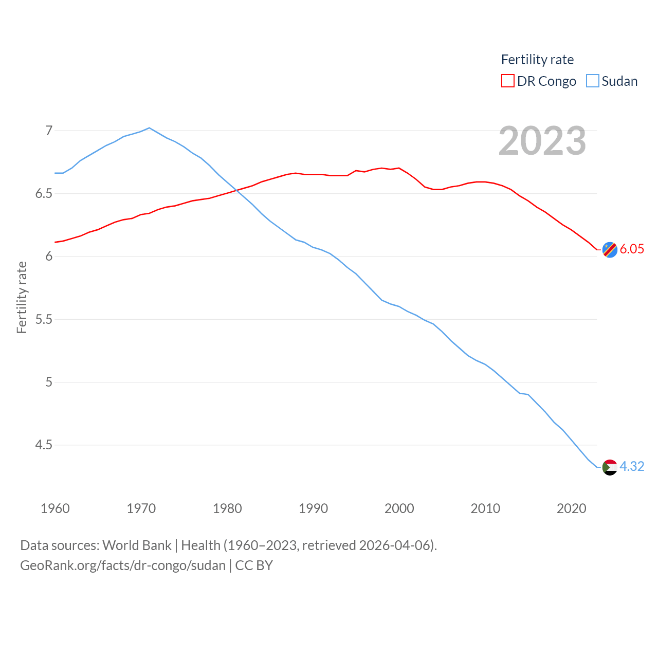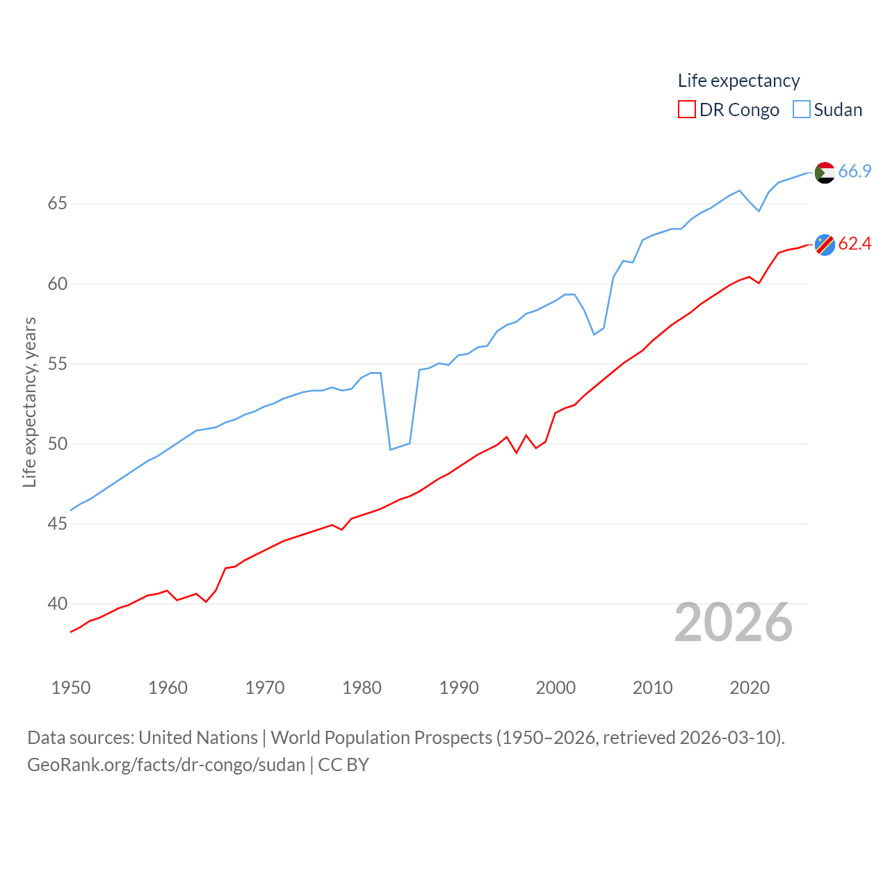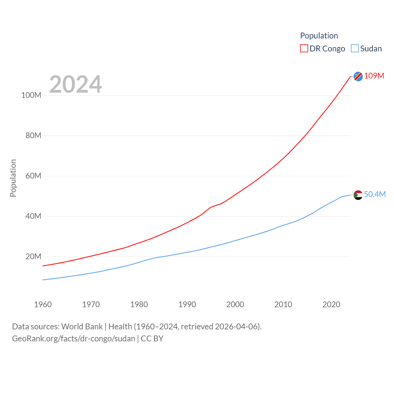 The DR Congo has a population of 109M (ranked 15/197), compared with 50.4M in Sudan (ranked 30/197). The DR Congo's land area is 875,313 sq mi versus 721,239 sq mi for Sudan (ranked 11th vs. 15th).
