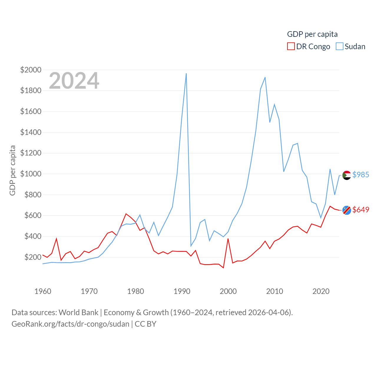 By GDP, The DR Congo ranks 87/197 ($71B) and Sudan ranks 94/197 ($49.7B). By GDP per capita, The DR Congo ranks 190/197 ($649), while Sudan ranks 179/197 ($985).