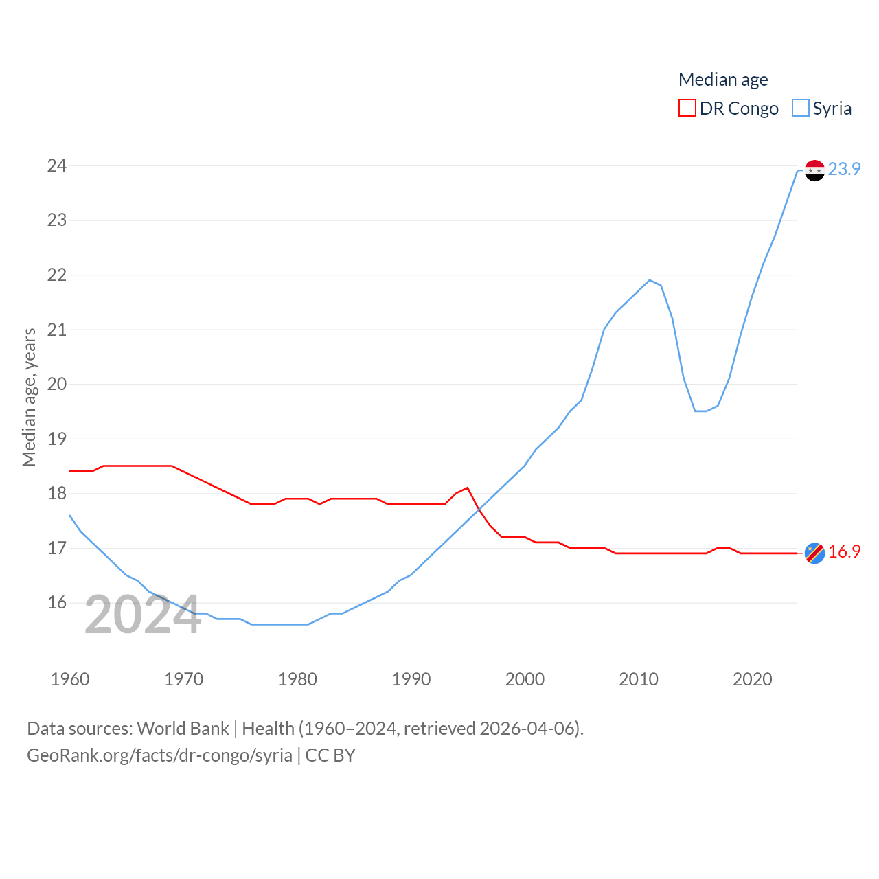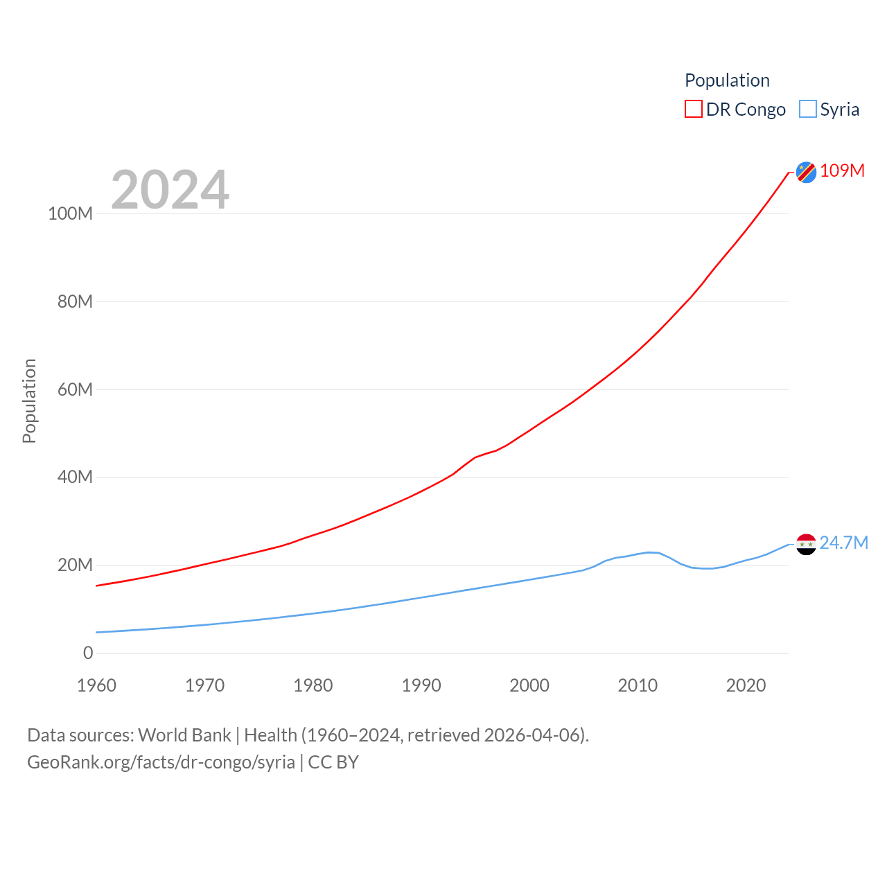 The DR Congo has a population of 109M (ranked 15/197), compared with 24.7M in Syria (ranked 57/197). The DR Congo's land area is 875,313 sq mi versus 70,900 sq mi for Syria (ranked 11th vs. 87th).