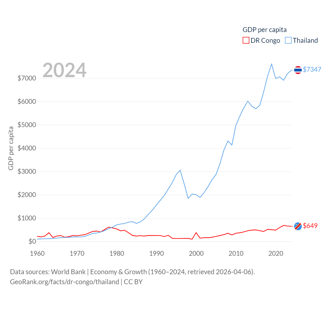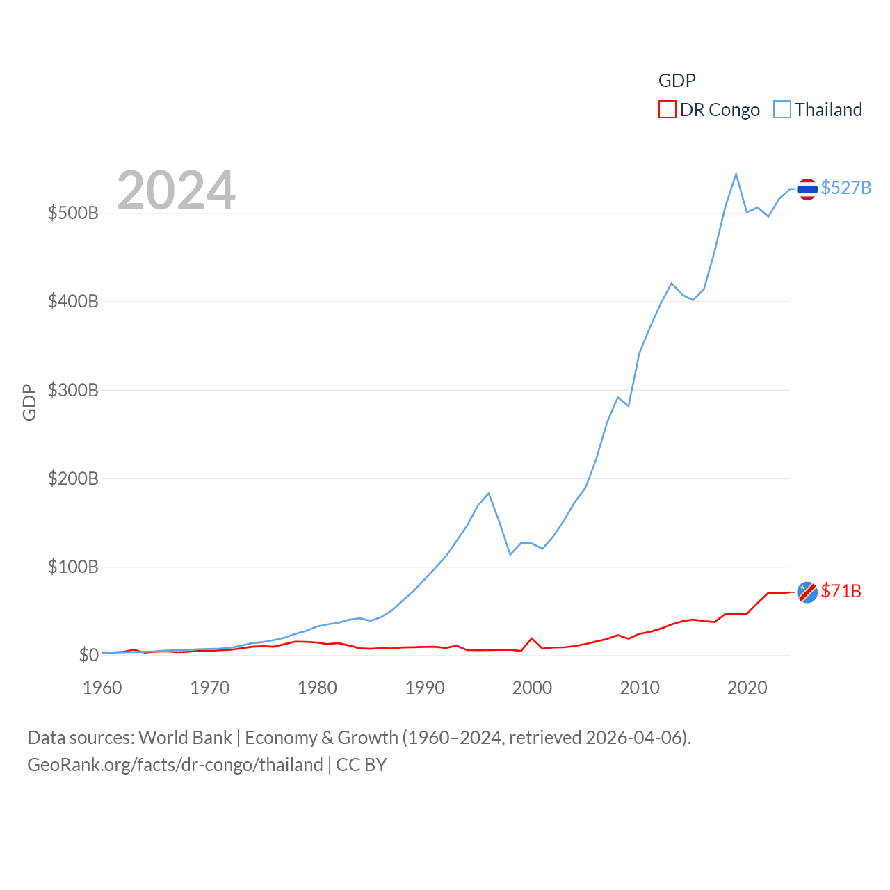 By GDP, The DR Congo ranks 87/197 ($71B) and Thailand ranks 31/197 ($527B). By GDP per capita, The DR Congo ranks 190/197 ($649), while Thailand ranks 100/197 ($7,347).