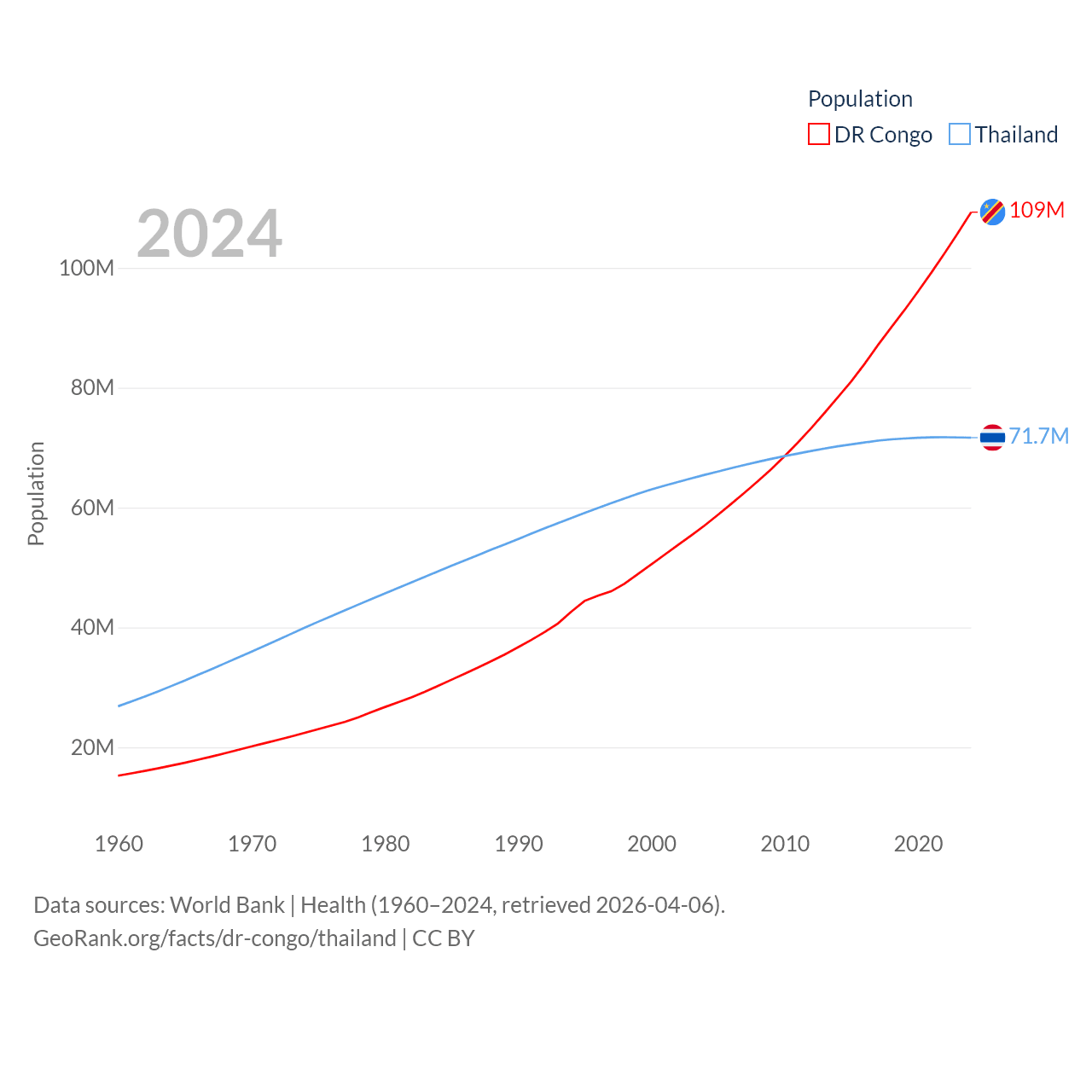 The DR Congo has a population of 109M (ranked 15/197), compared with 71.7M in Thailand (ranked 20/197). The DR Congo's land area is 875,313 sq mi versus 197,256 sq mi for Thailand (ranked 11th vs. 50th).