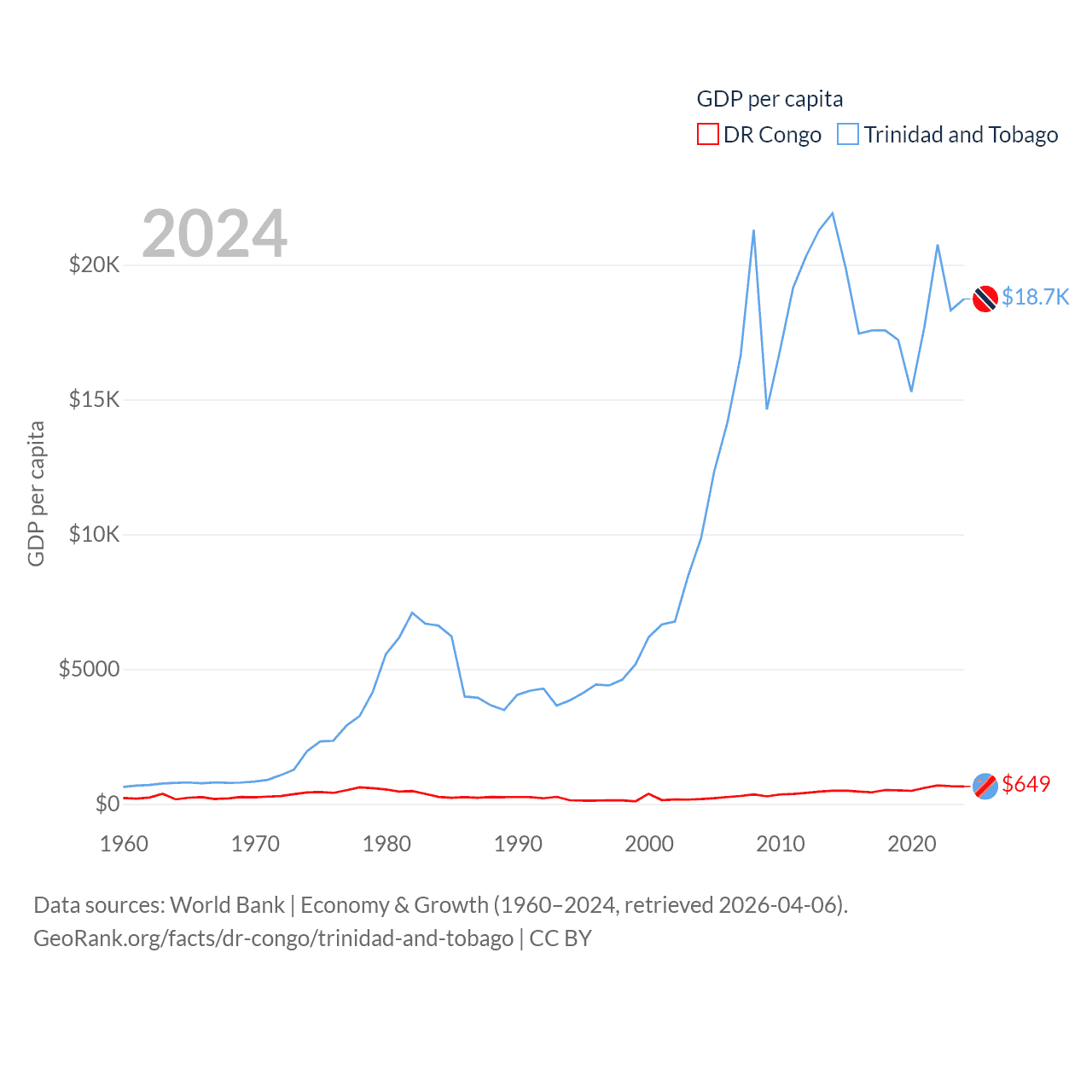 By GDP, The DR Congo ranks 87/197 ($71B) and Trinidad and Tobago ranks 115/197 ($25.6B). By GDP per capita, The DR Congo ranks 190/197 ($649), while Trinidad and Tobago ranks 61/197 ($18,733).