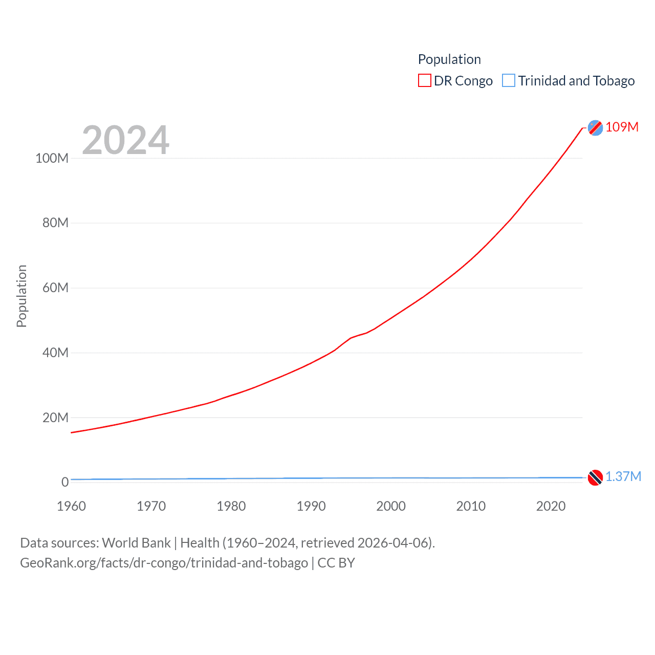 The DR Congo has a population of 109M (ranked 15/197), compared with 1.37M in Trinidad and Tobago (ranked 154/197). The DR Congo's land area is 875,313 sq mi versus 1,981 sq mi for Trinidad and Tobago (ranked 11th vs. 166th).