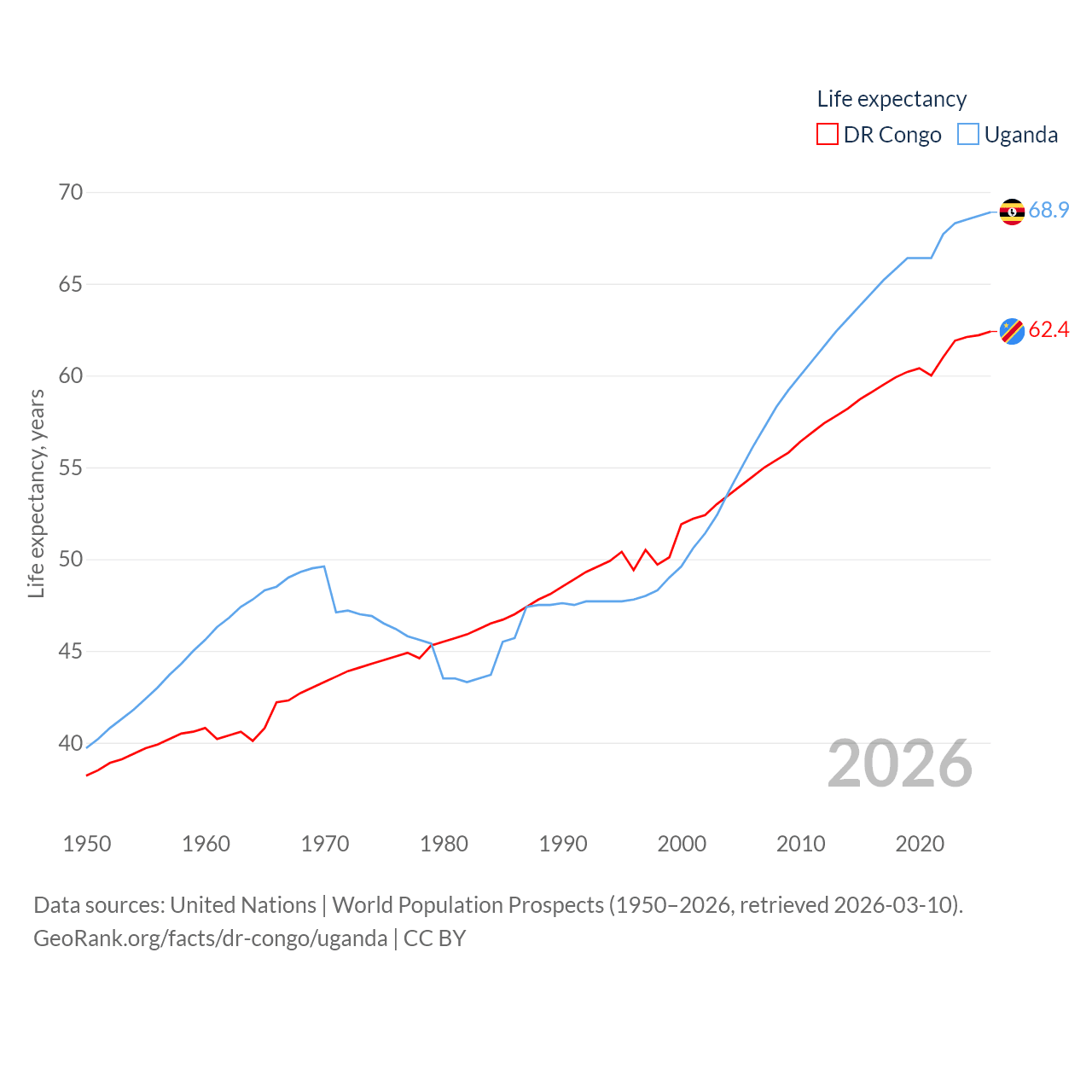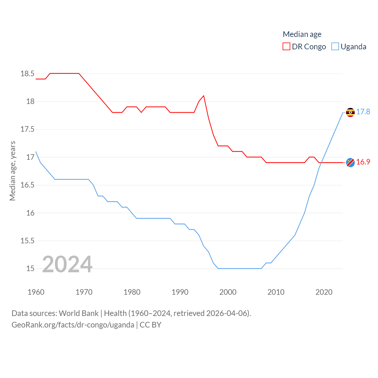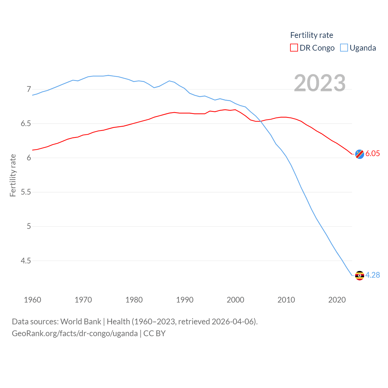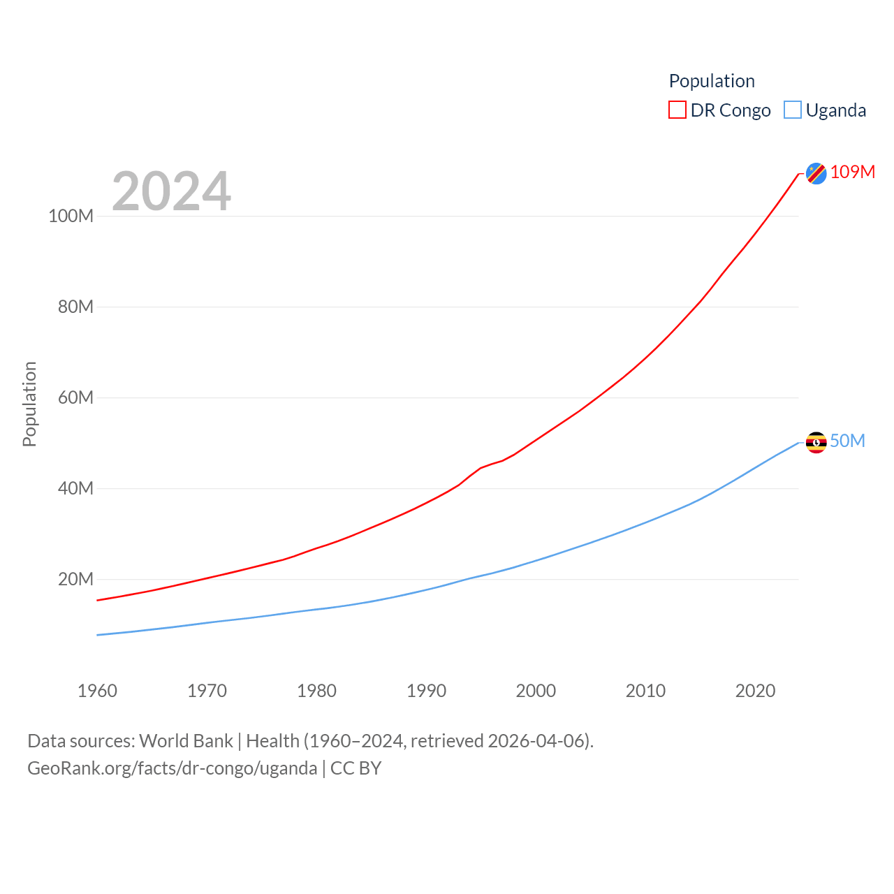 The DR Congo has a population of 109M (ranked 15/197), compared with 50M in Uganda (ranked 31/197). The DR Congo's land area is 875,313 sq mi versus 77,421 sq mi for Uganda (ranked 11th vs. 84th).