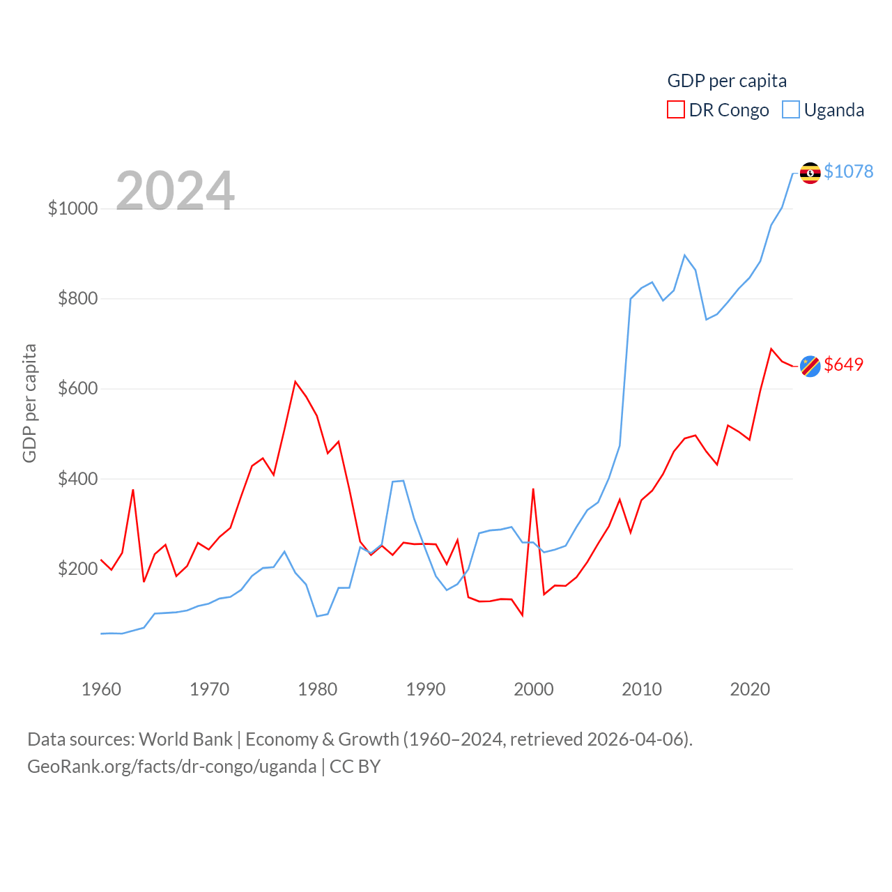 By GDP, The DR Congo ranks 87/197 ($71B) and Uganda ranks 89/197 ($53.9B). By GDP per capita, The DR Congo ranks 190/197 ($649), while Uganda ranks 176/197 ($1,078).