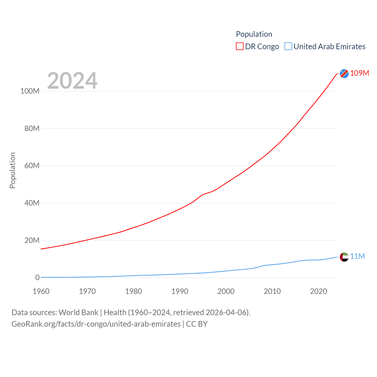 The DR Congo has a population of 109M (ranked 15/197), compared with 11M in The United Arab Emirates (ranked 86/197). The DR Congo's land area is 875,313 sq mi versus 27,421 sq mi for The United Arab Emirates (ranked 11th vs. 117th).