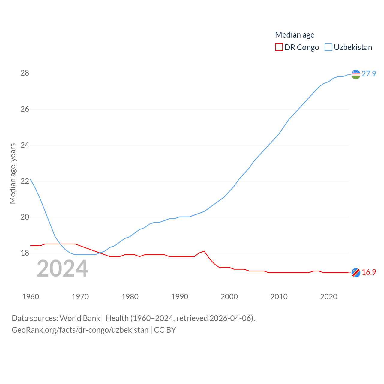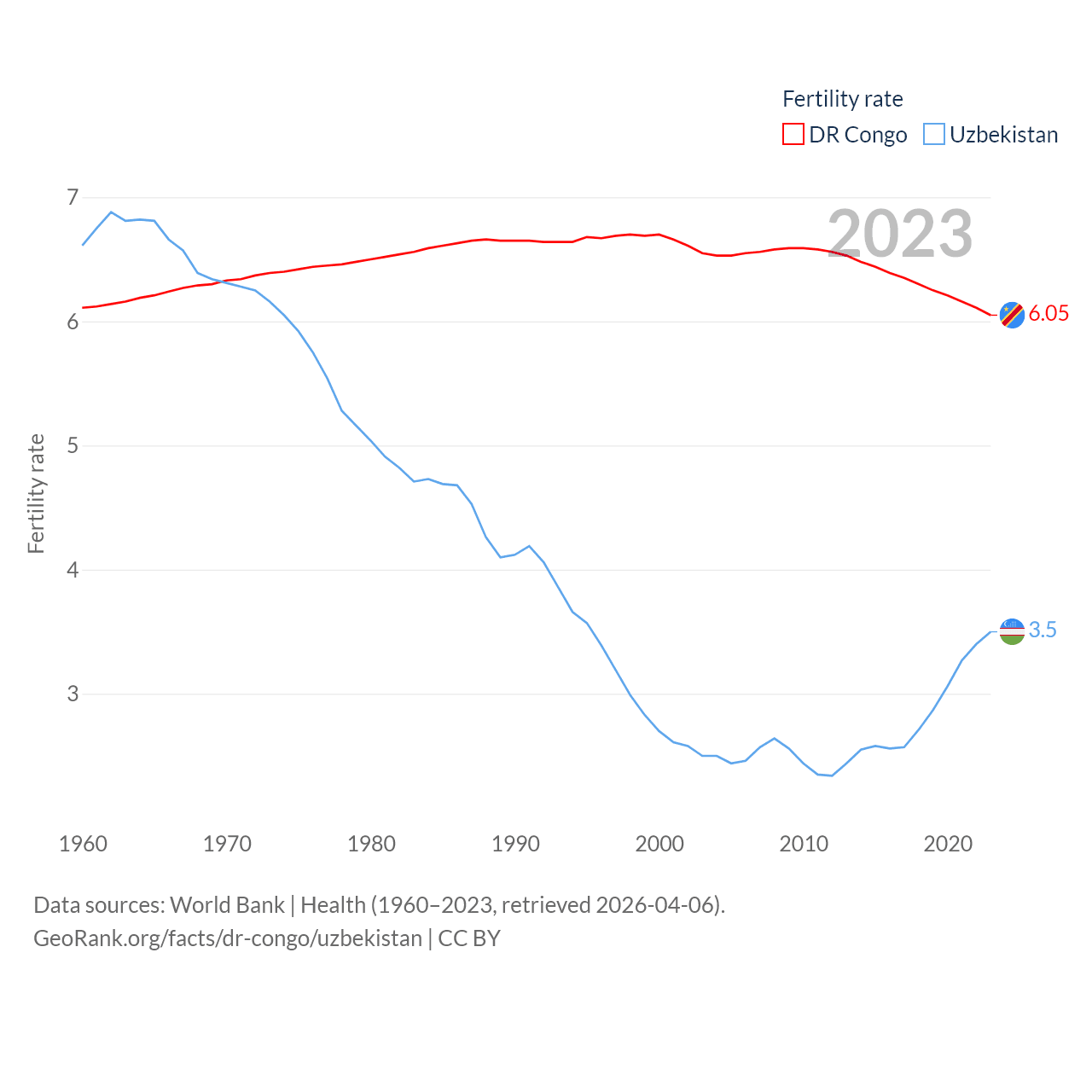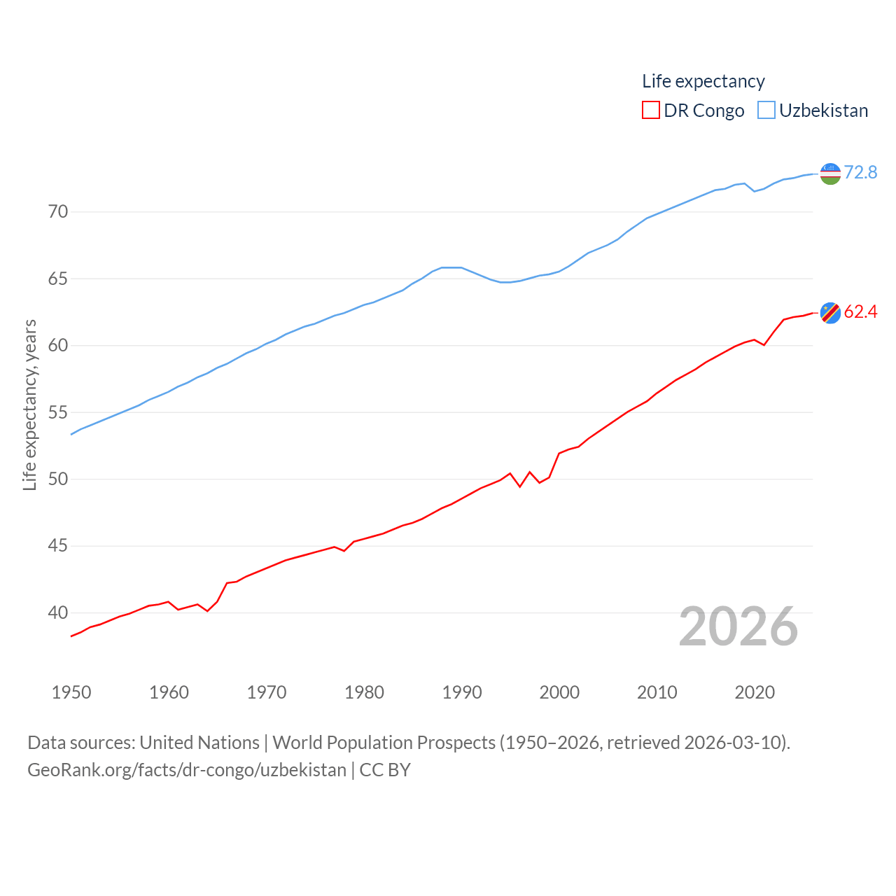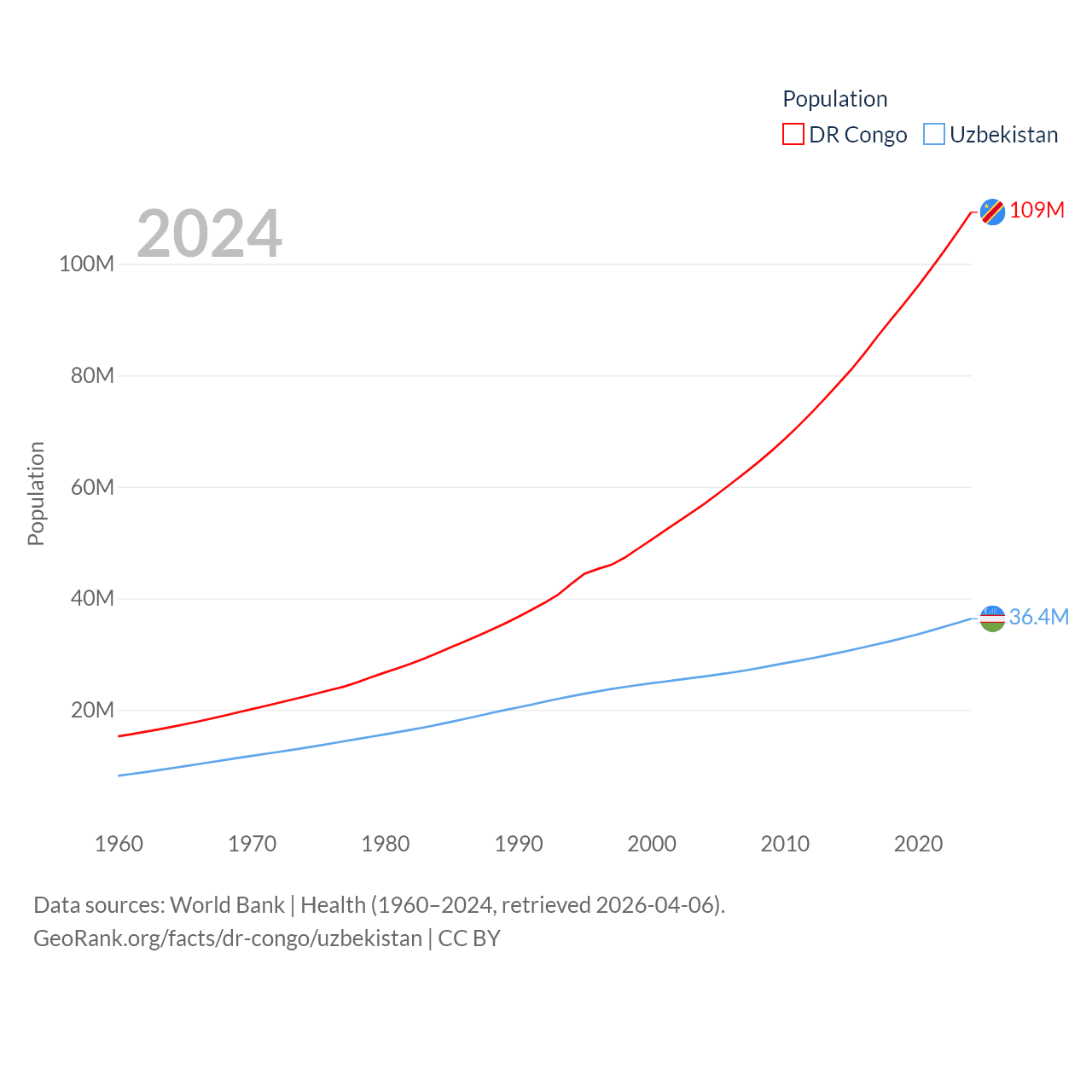 The DR Congo has a population of 109M (ranked 15/197), compared with 36.4M in Uzbekistan (ranked 43/197). The DR Congo's land area is 875,313 sq mi versus 170,136 sq mi for Uzbekistan (ranked 11th vs. 56th).