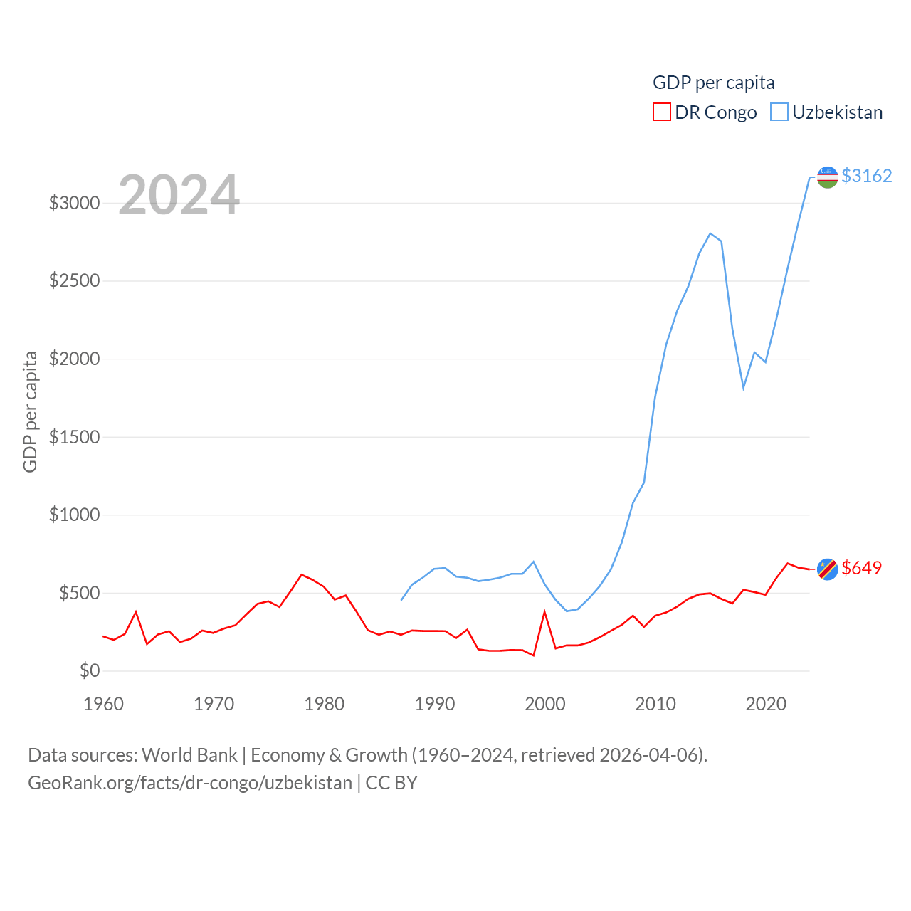 By GDP, The DR Congo ranks 87/197 ($71B) and Uzbekistan ranks 66/197 ($115B). By GDP per capita, The DR Congo ranks 190/197 ($649), while Uzbekistan ranks 139/197 ($3,162).