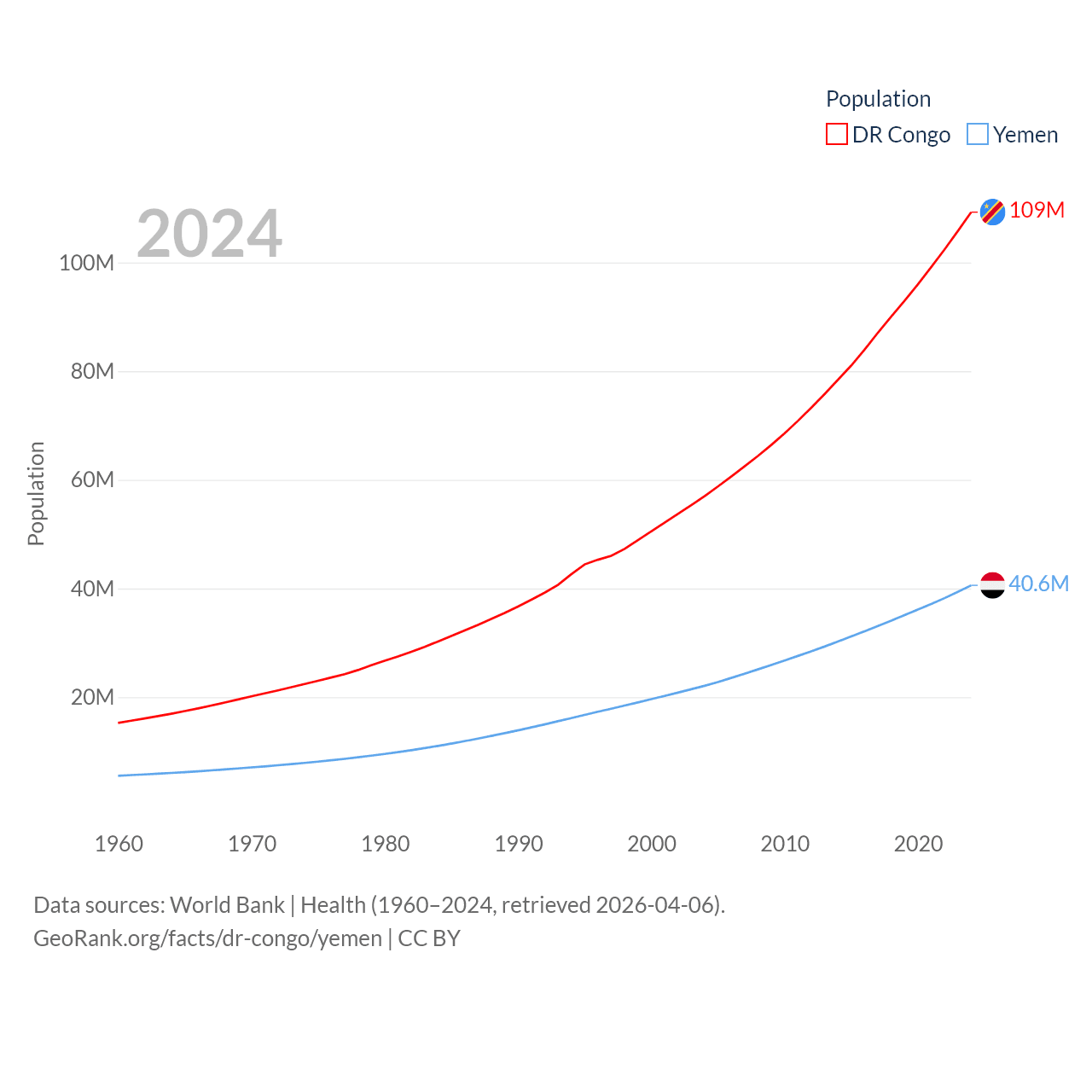 The DR Congo has a population of 109M (ranked 15/197), compared with 40.6M in Yemen (ranked 38/197). The DR Congo's land area is 875,313 sq mi versus 203,850 sq mi for Yemen (ranked 11th vs. 49th).