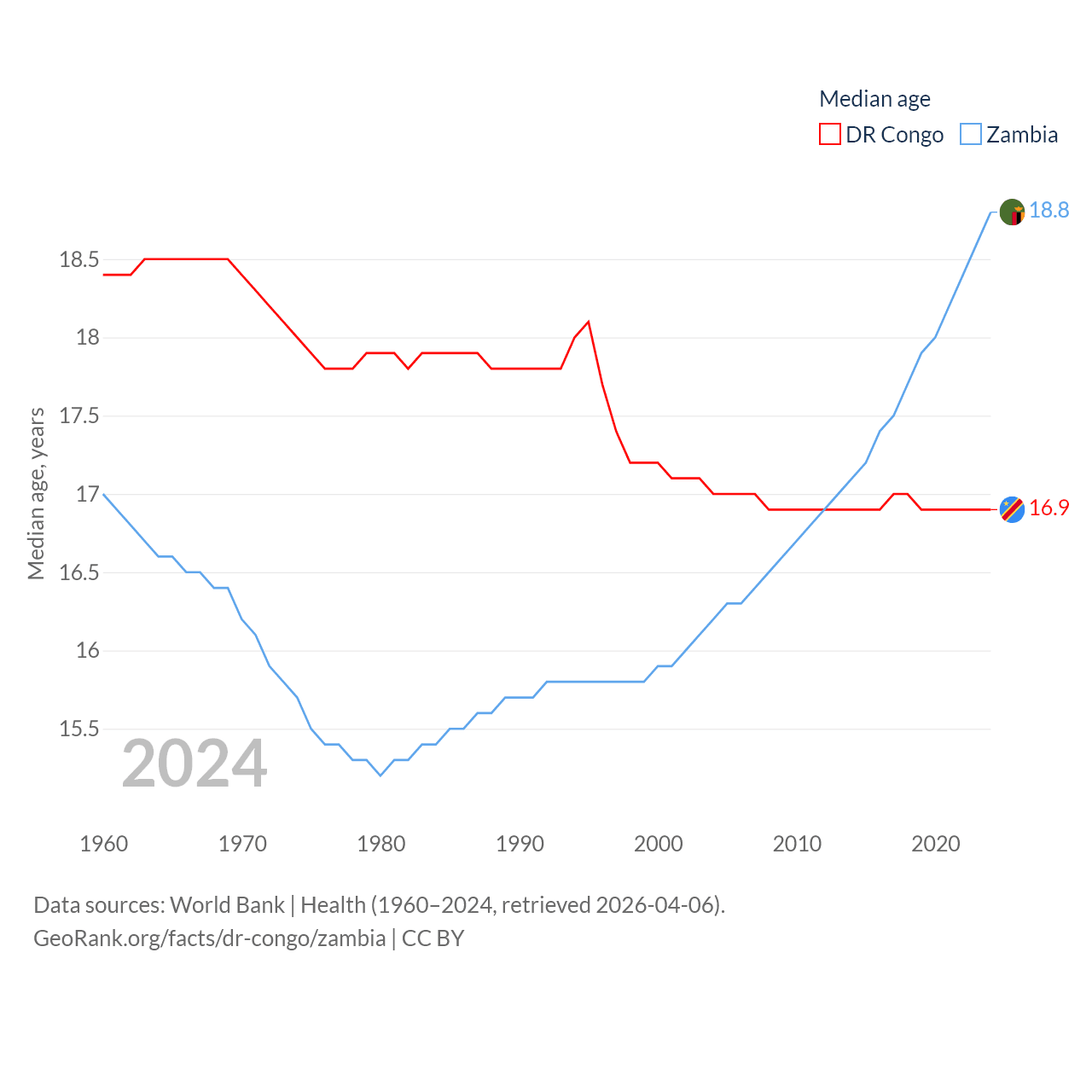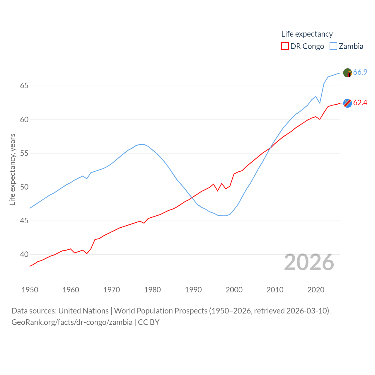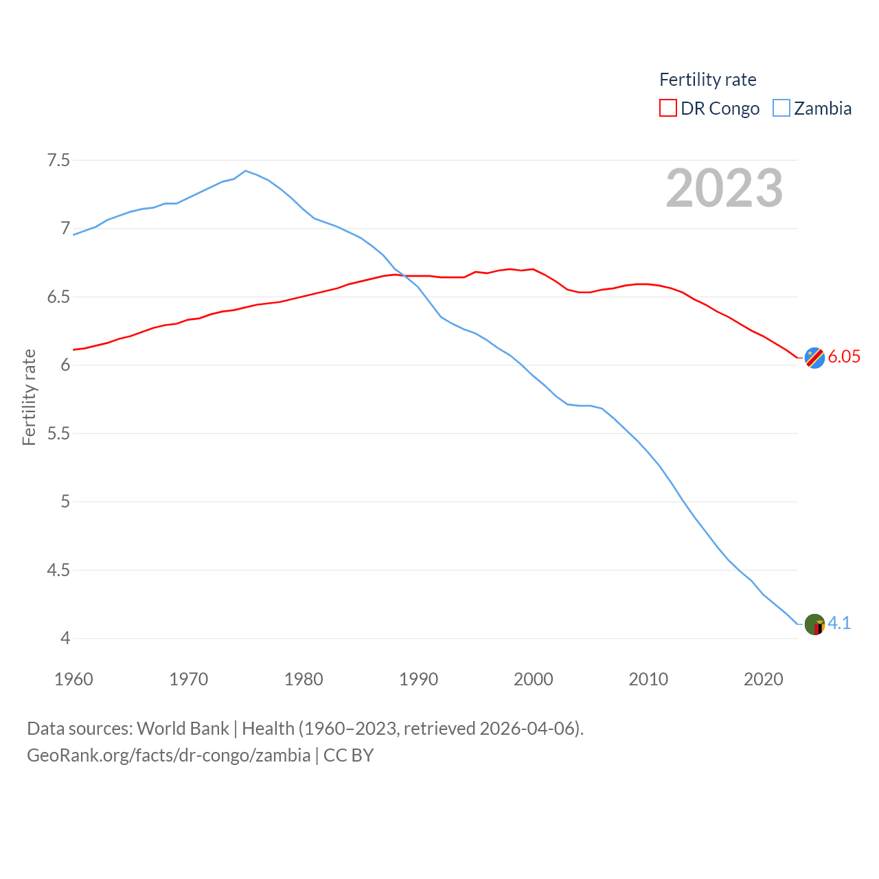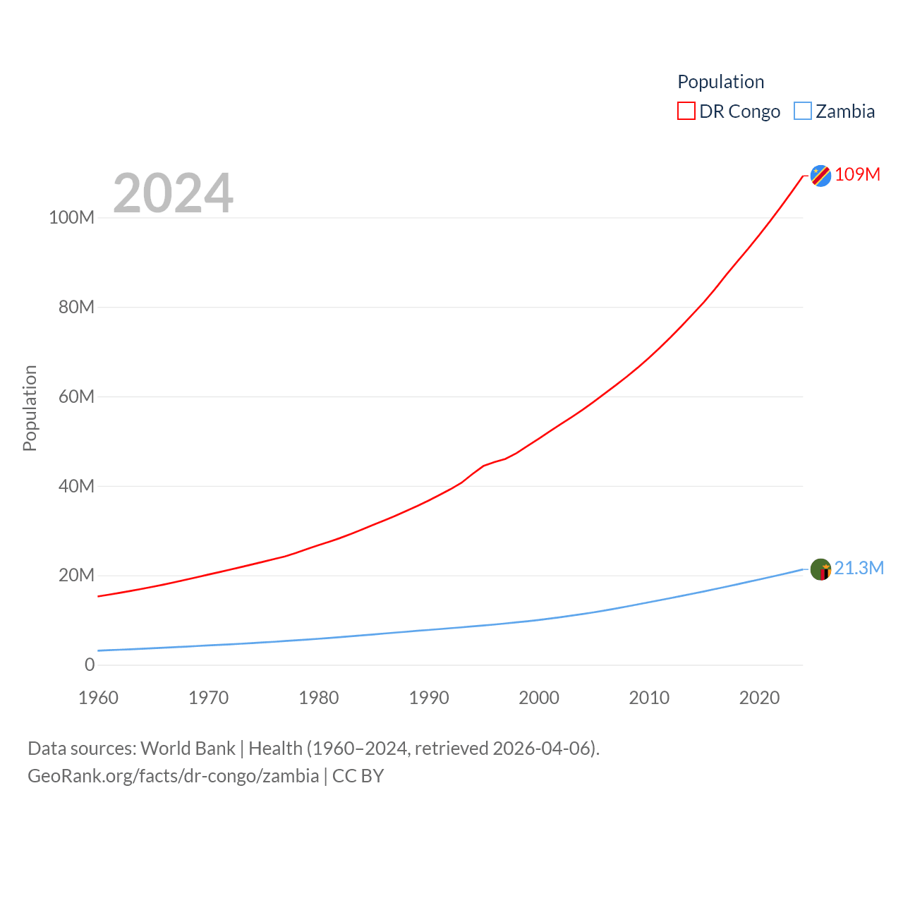 The DR Congo has a population of 109M (ranked 15/197), compared with 21.3M in Zambia (ranked 63/197). The DR Congo's land area is 875,313 sq mi versus 287,024 sq mi for Zambia (ranked 11th vs. 37th).