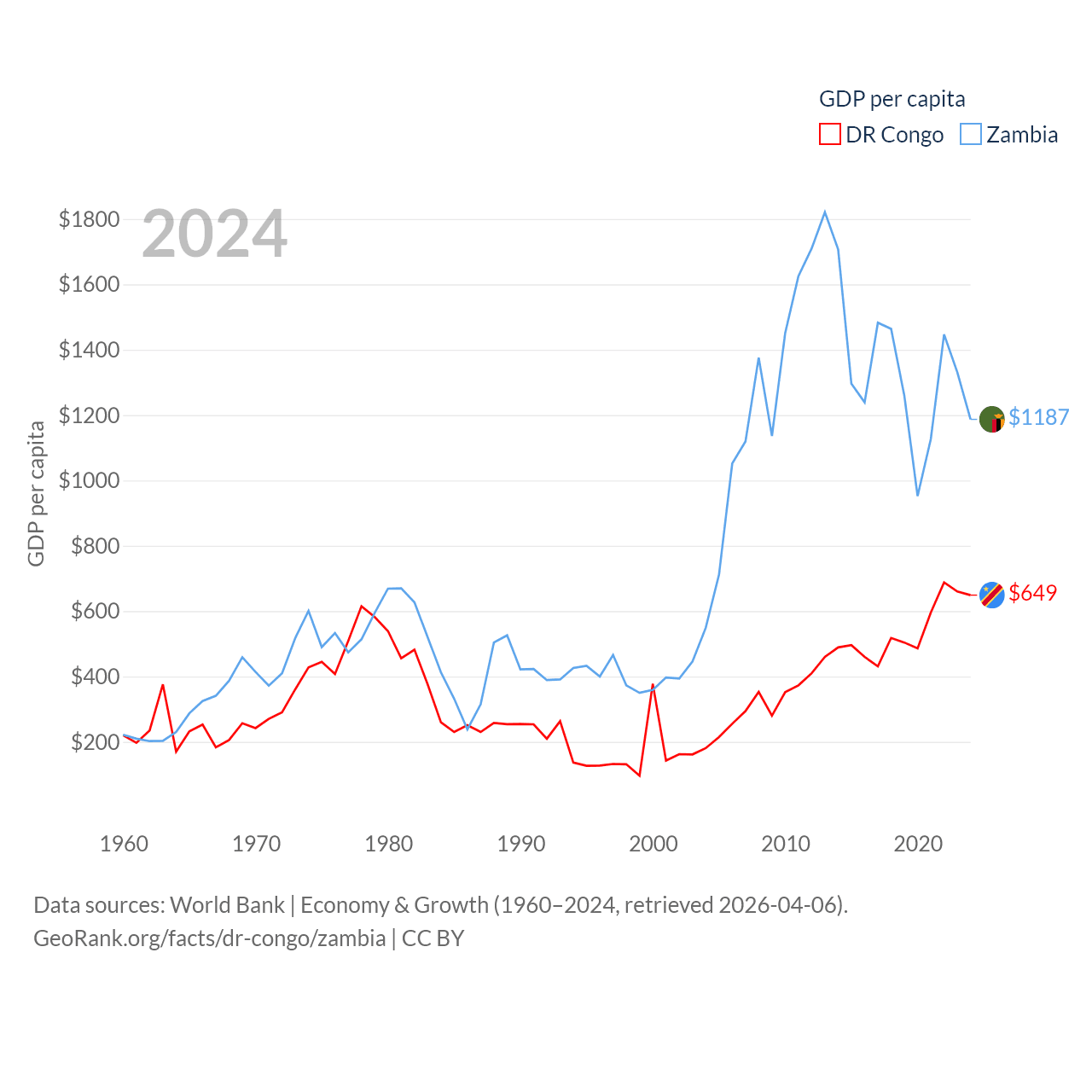 By GDP, The DR Congo ranks 87/197 ($71B) and Zambia ranks 116/197 ($25.3B). By GDP per capita, The DR Congo ranks 190/197 ($649), while Zambia ranks 169/197 ($1,187).