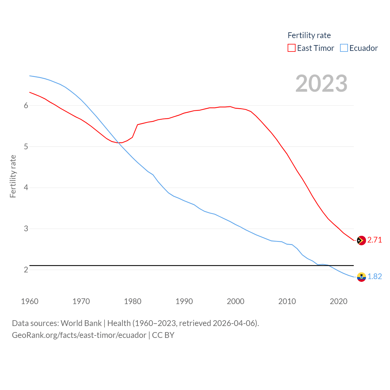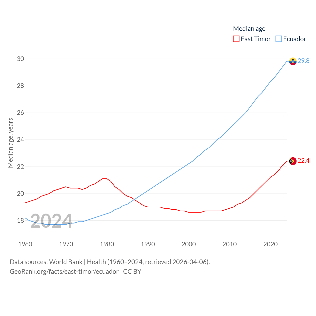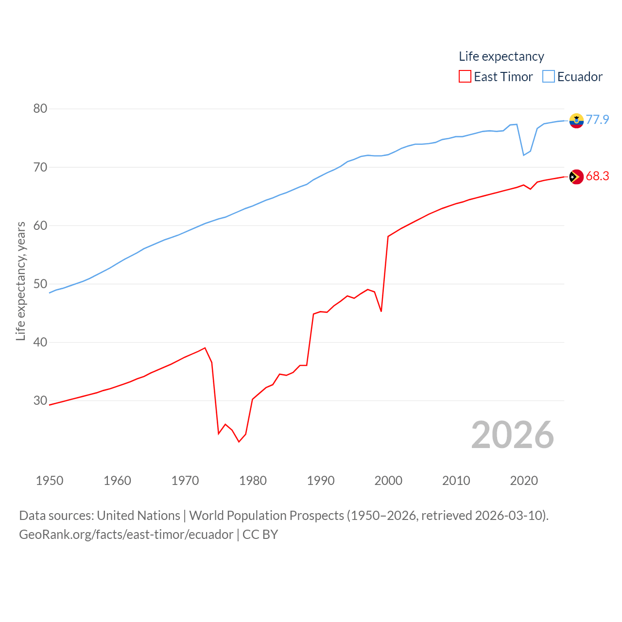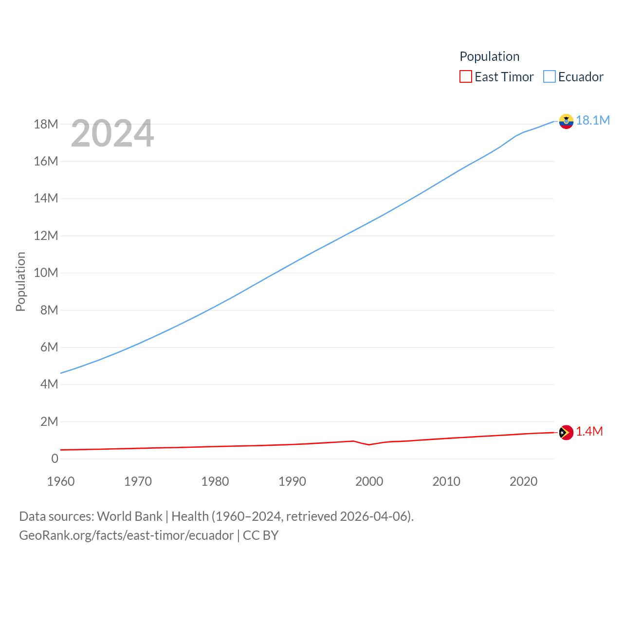East Timor has a population of 1.4M (ranked 152/197), compared with 18.1M in Ecuador (ranked 71/197). East Timor's land area is 5,741 sq mi versus 95,892 sq mi for Ecuador (ranked 155th vs. 76th).