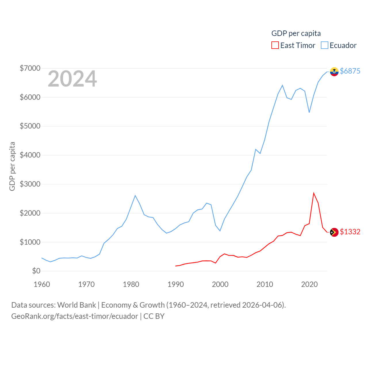 By GDP, East Timor ranks 181/197 ($1.87B) and Ecuador ranks 62/197 ($125B). By GDP per capita, East Timor ranks 167/197 ($1,332), while Ecuador ranks 103/197 ($6,875).
