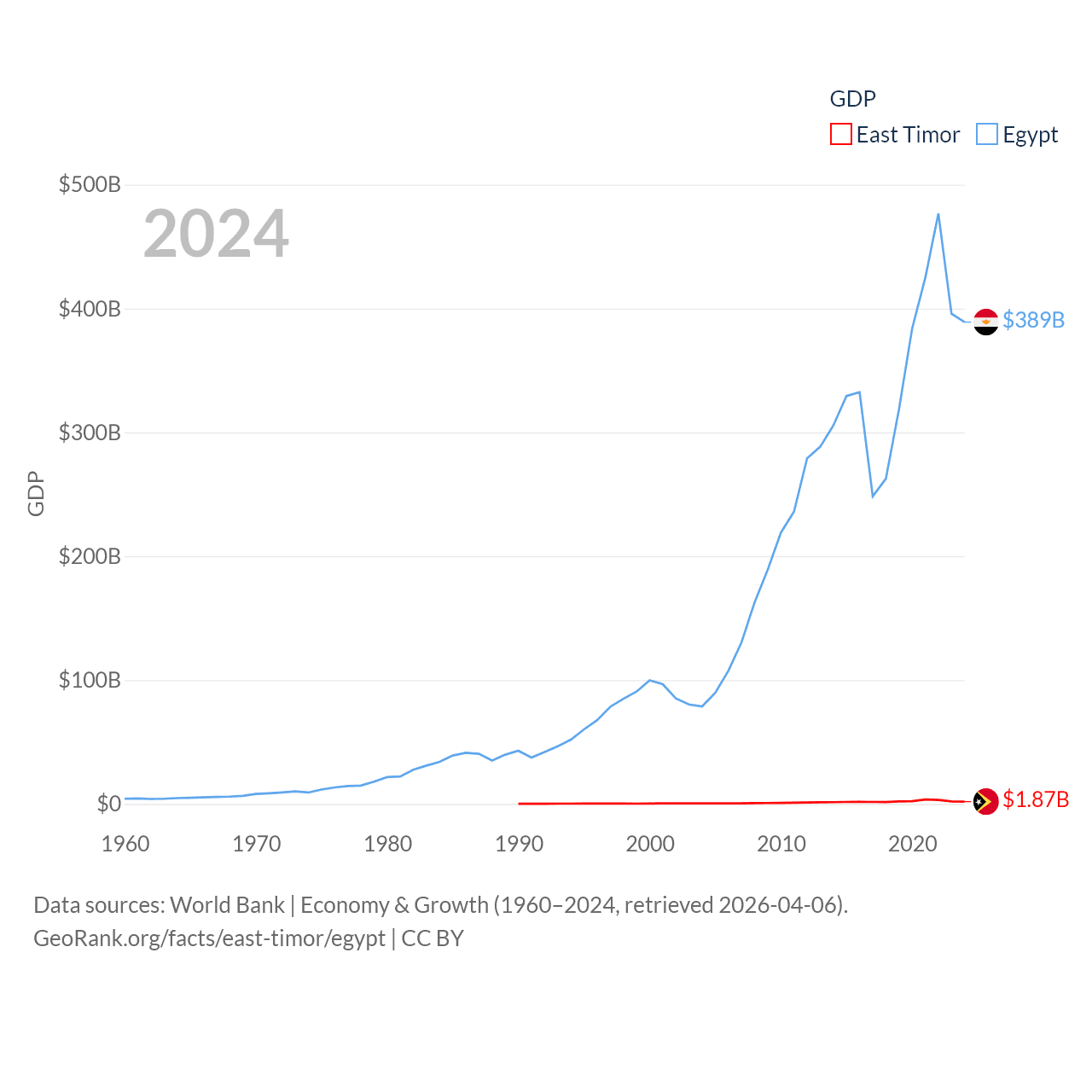 By GDP, East Timor ranks 181/197 ($1.87B) and Egypt ranks 41/197 ($389B). By GDP per capita, East Timor ranks 167/197 ($1,332), while Egypt ranks 138/197 ($3,338).