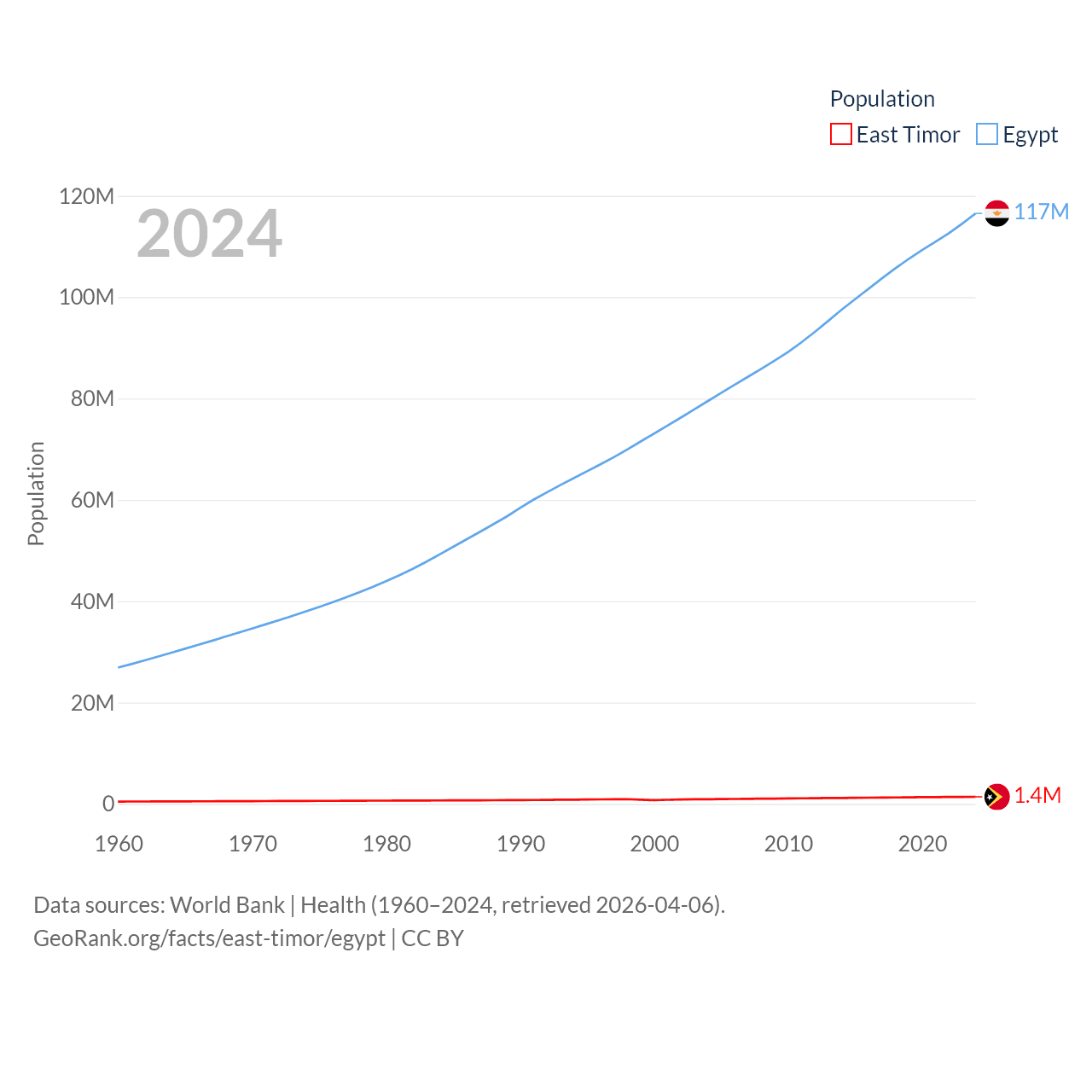 East Timor has a population of 1.4M (ranked 152/197), compared with 117M in Egypt (ranked 13/197). East Timor's land area is 5,741 sq mi versus 384,345 sq mi for Egypt (ranked 155th vs. 29th).
