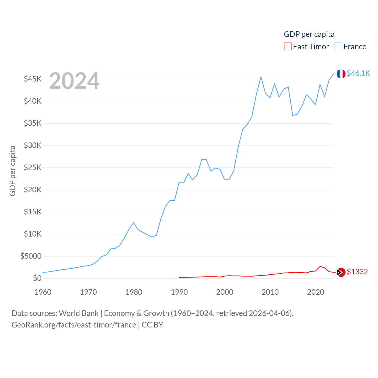 By GDP, East Timor ranks 181/197 ($1.87B) and France ranks 7/197 ($3.16T). By GDP per capita, East Timor ranks 167/197 ($1,332), while France ranks 27/197 ($46,103).
