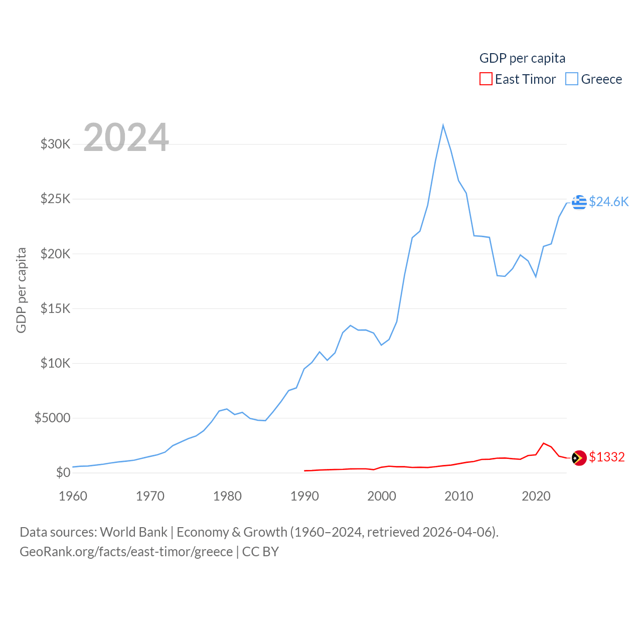 By GDP, East Timor ranks 181/197 ($1.87B) and Greece ranks 53/197 ($256B). By GDP per capita, East Timor ranks 167/197 ($1,332), while Greece ranks 49/197 ($24,626).