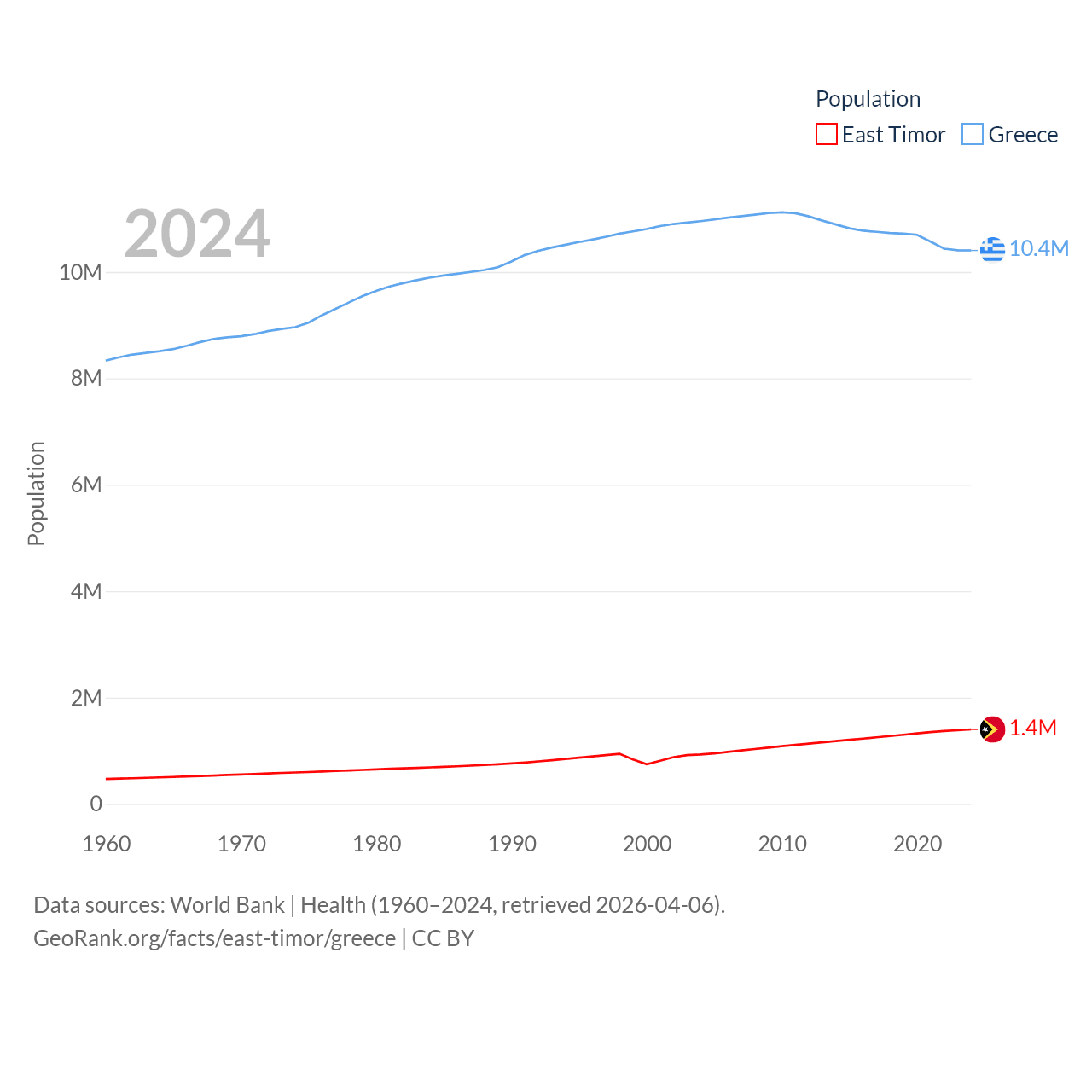 East Timor has a population of 1.4M (ranked 152/197), compared with 10.4M in Greece (ranked 94/197). East Timor's land area is 5,741 sq mi versus 49,769 sq mi for Greece (ranked 155th vs. 95th).