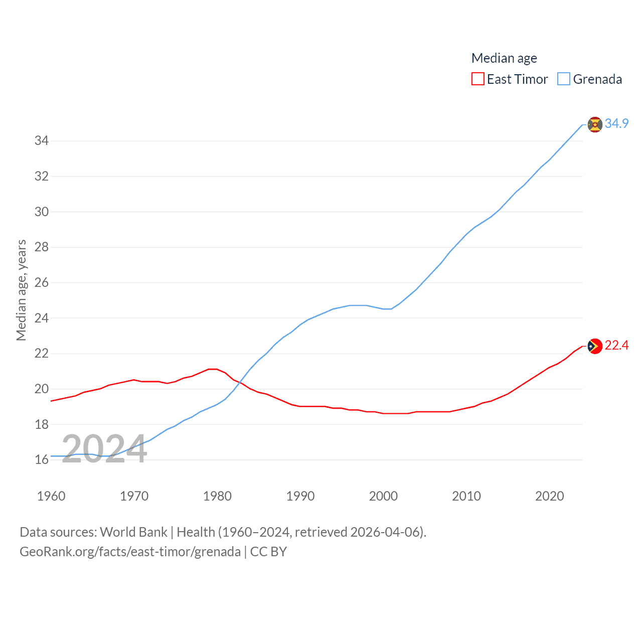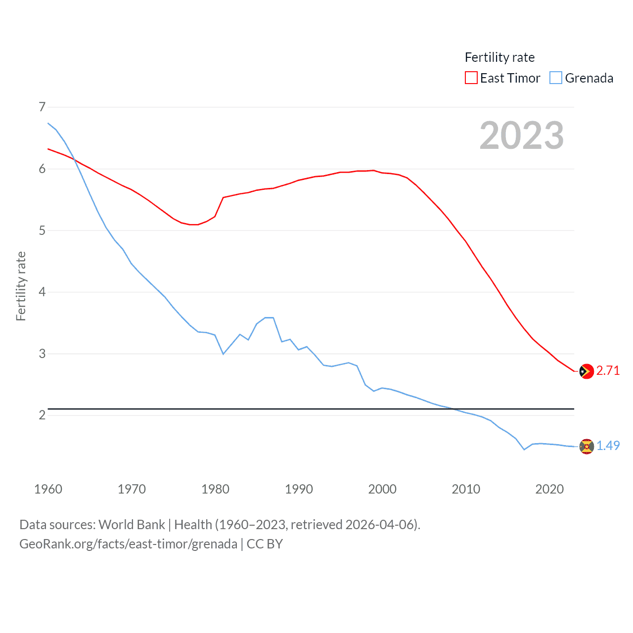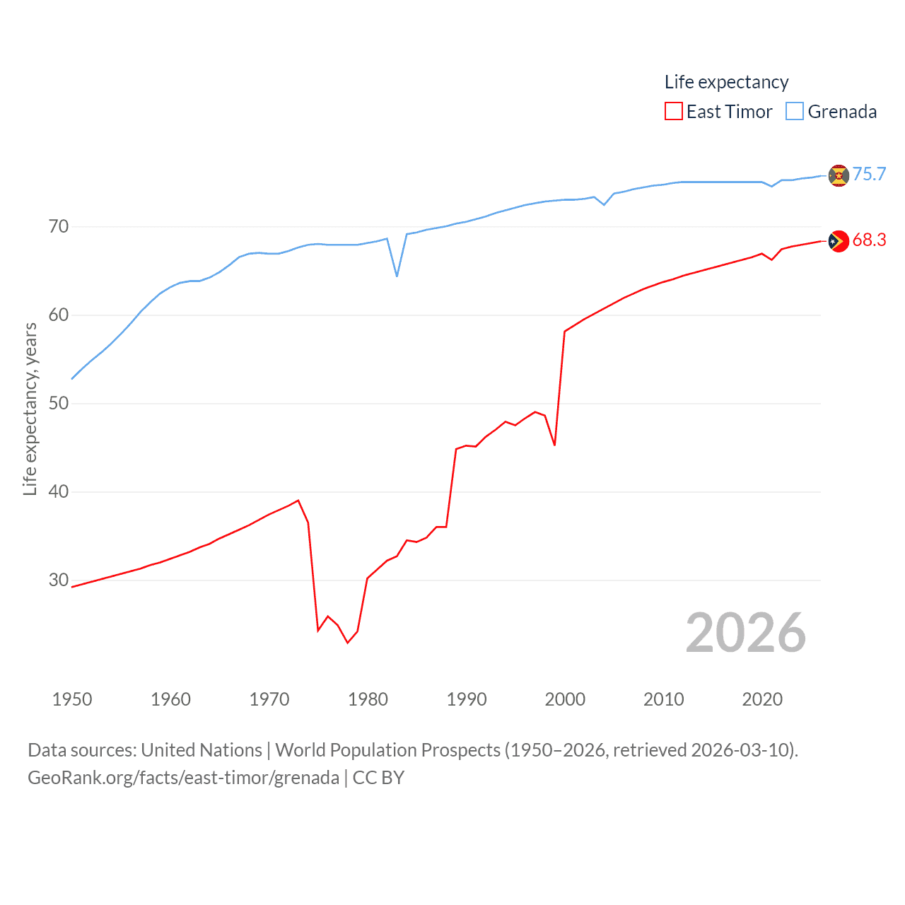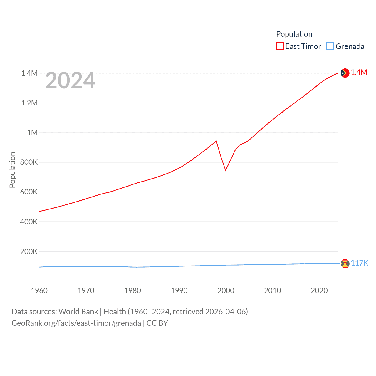 East Timor has a population of 1.4M (ranked 152/197), compared with 117K in Grenada (ranked 182/197). East Timor's land area is 5,741 sq mi versus 131.3 sq mi for Grenada (ranked 155th vs. 186th).