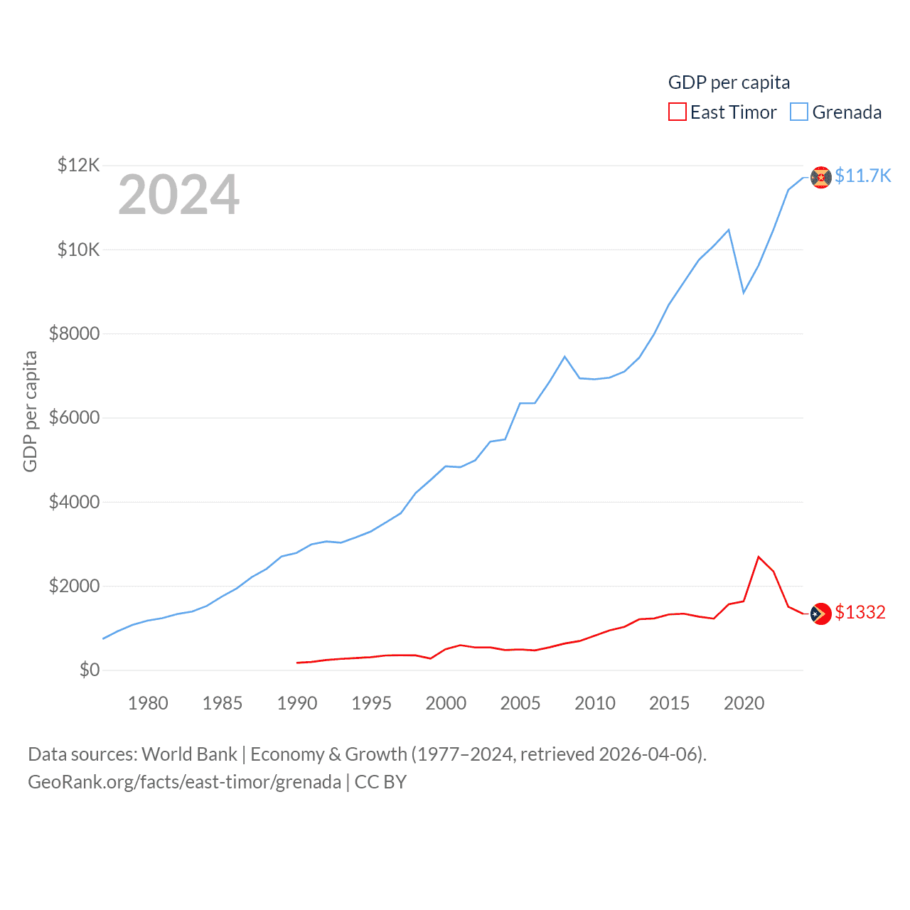 By GDP, East Timor ranks 181/197 ($1.87B) and Grenada ranks 184/197 ($1.37B). By GDP per capita, East Timor ranks 167/197 ($1,332), while Grenada ranks 80/197 ($11,705).
