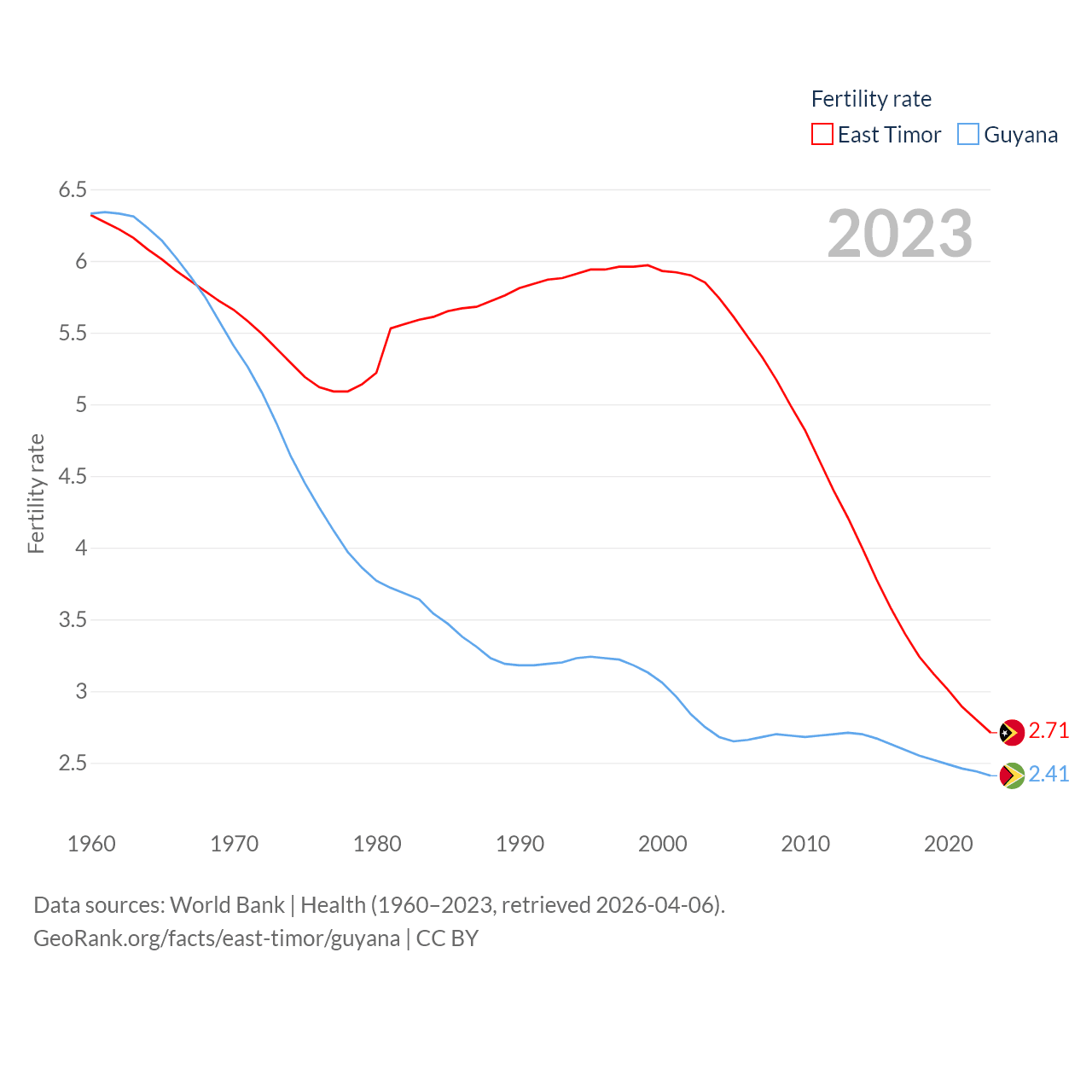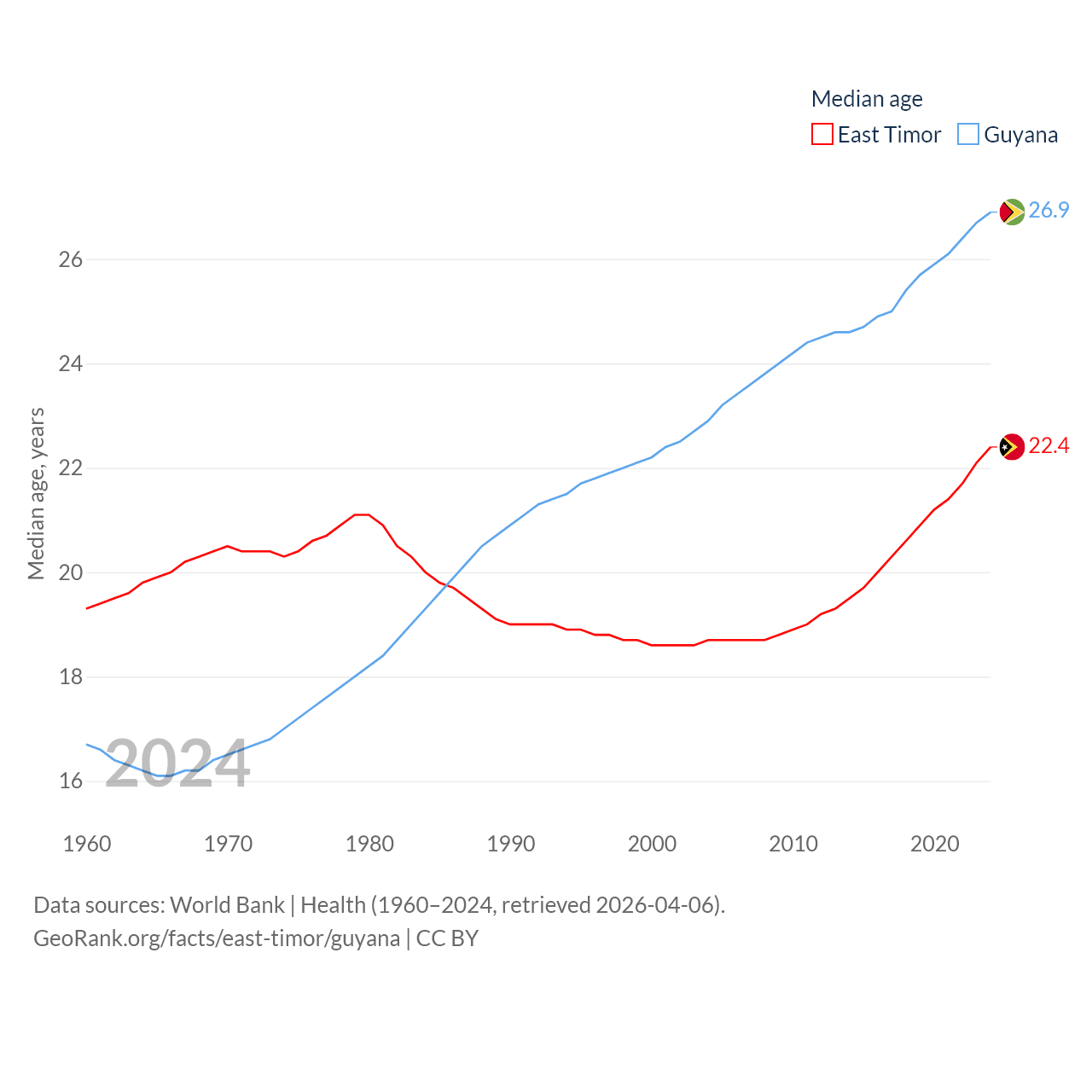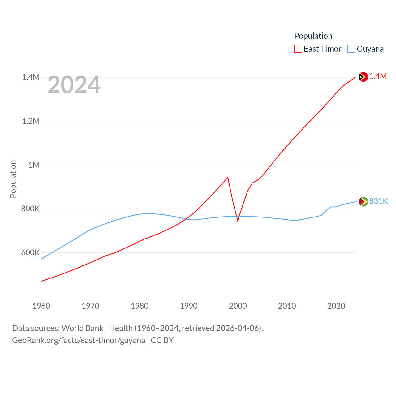 East Timor has a population of 1.4M (ranked 152/197), compared with 831K in Guyana (ranked 161/197). East Timor's land area is 5,741 sq mi versus 81,522 sq mi for Guyana (ranked 155th vs. 82nd).