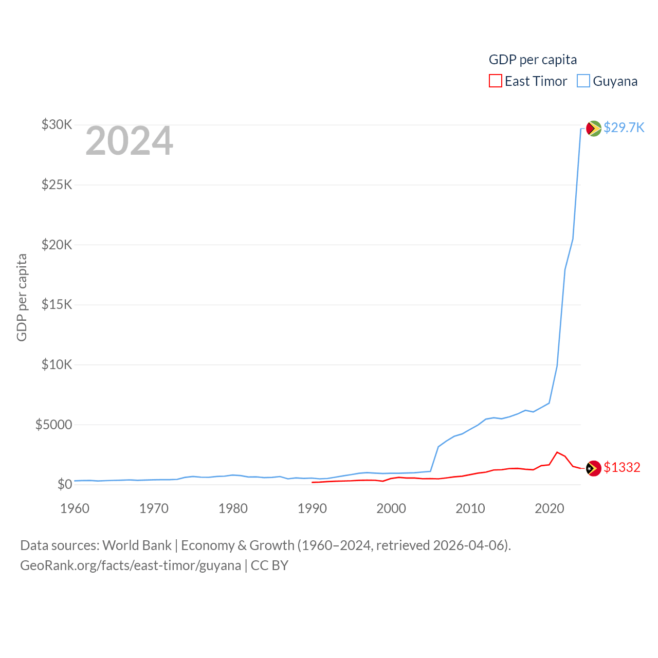By GDP, East Timor ranks 181/197 ($1.87B) and Guyana ranks 120/197 ($24.7B). By GDP per capita, East Timor ranks 167/197 ($1,332), while Guyana ranks 41/197 ($29,675).