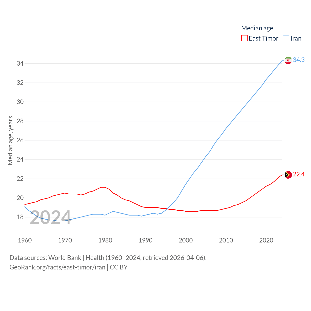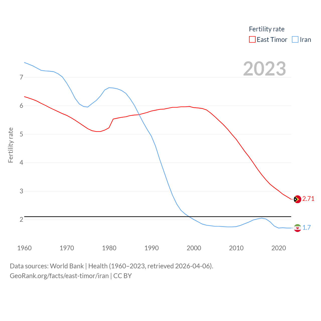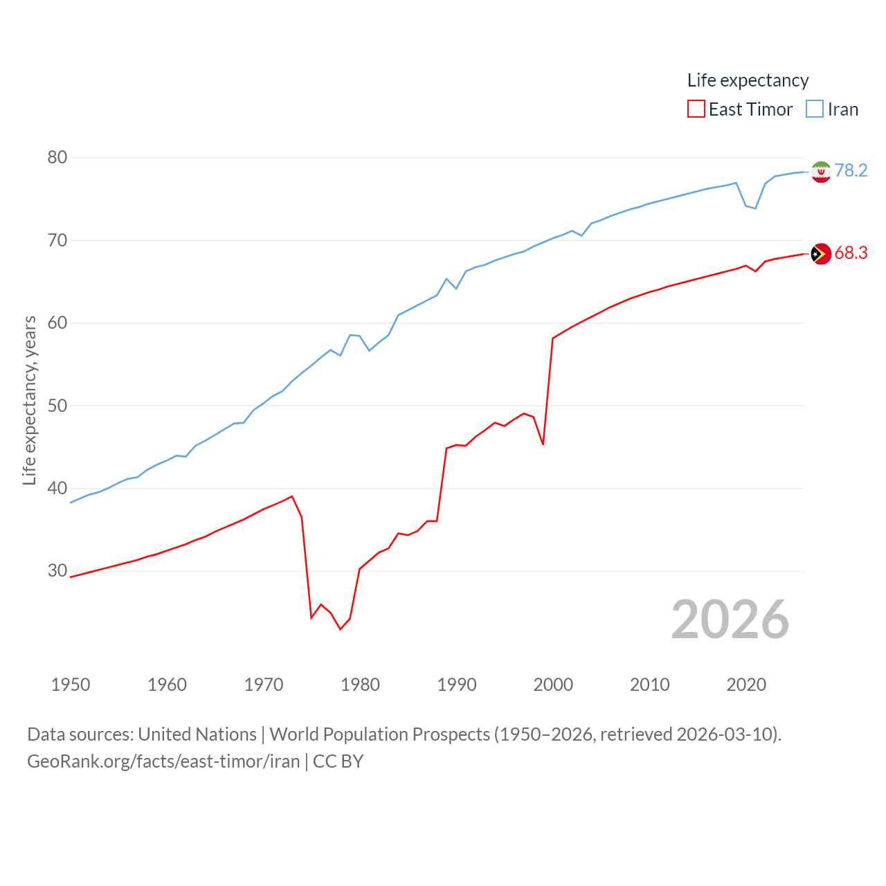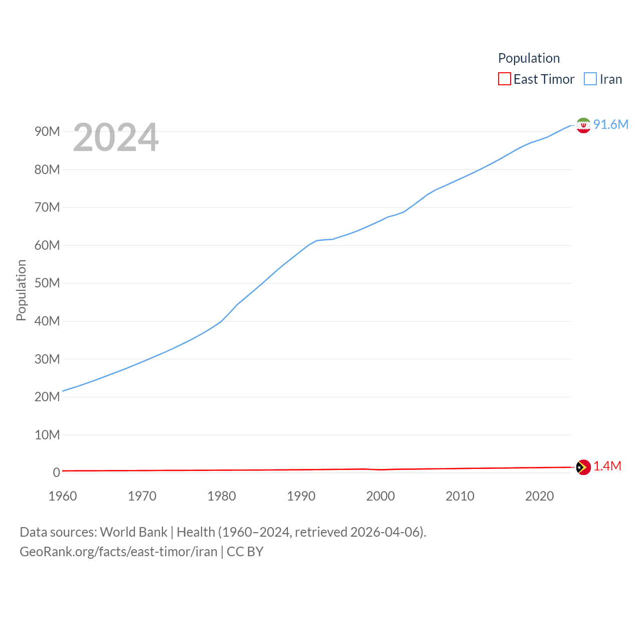 East Timor has a population of 1.4M (ranked 152/197), compared with 91.6M in Iran (ranked 17/197). East Timor's land area is 5,741 sq mi versus 626,451 sq mi for Iran (ranked 155th vs. 17th).