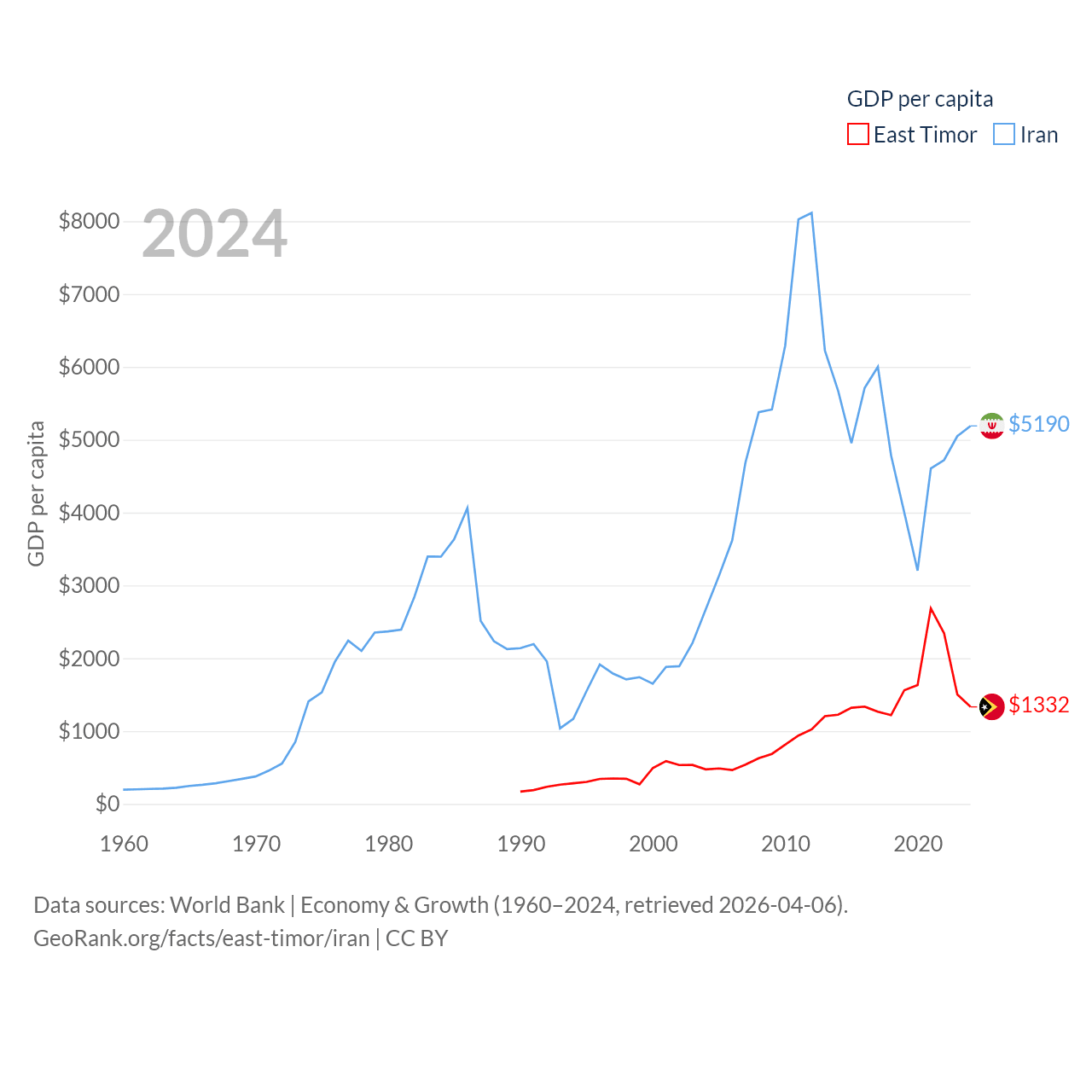 By GDP, East Timor ranks 181/197 ($1.87B) and Iran ranks 34/197 ($475B). By GDP per capita, East Timor ranks 167/197 ($1,332), while Iran ranks 119/197 ($5,190).