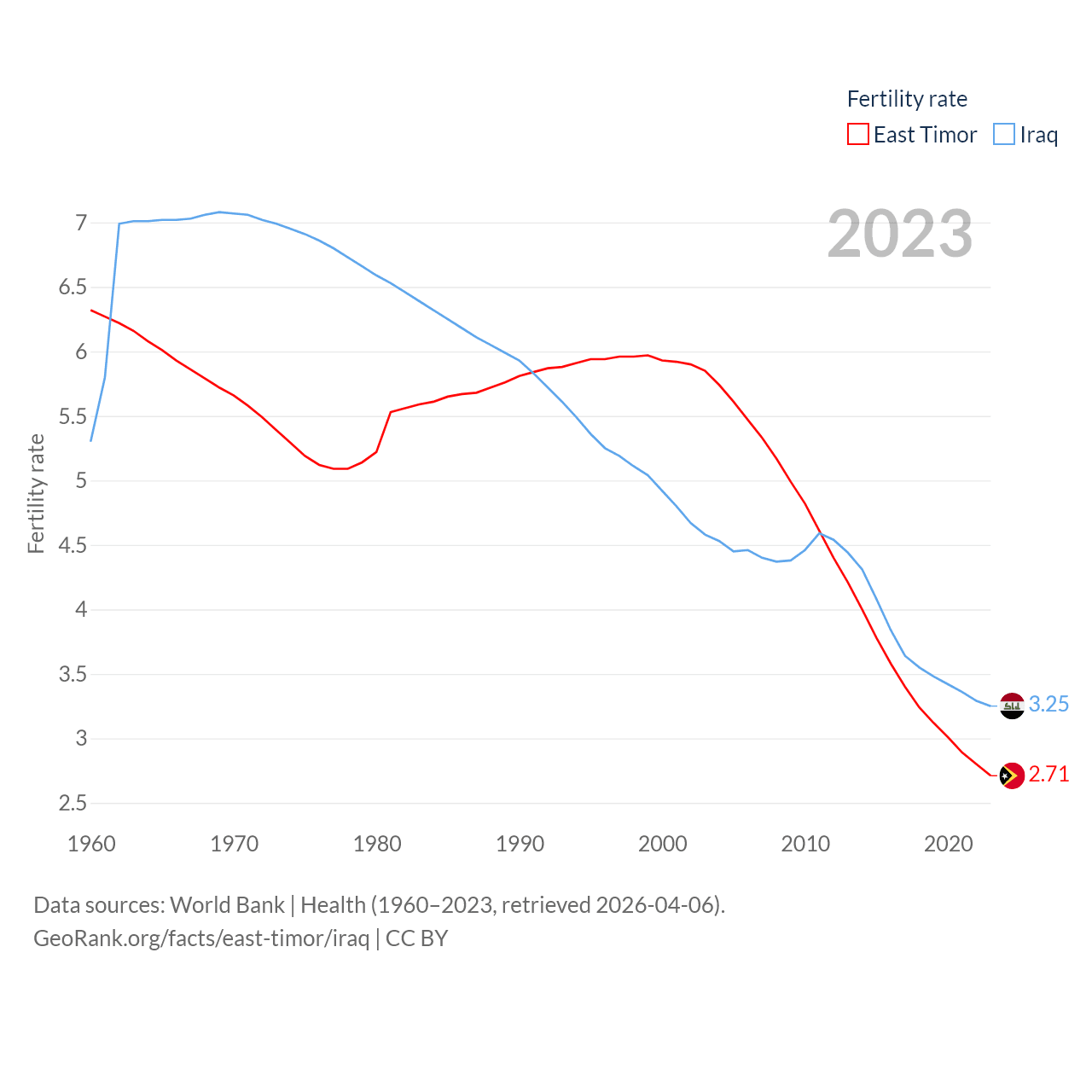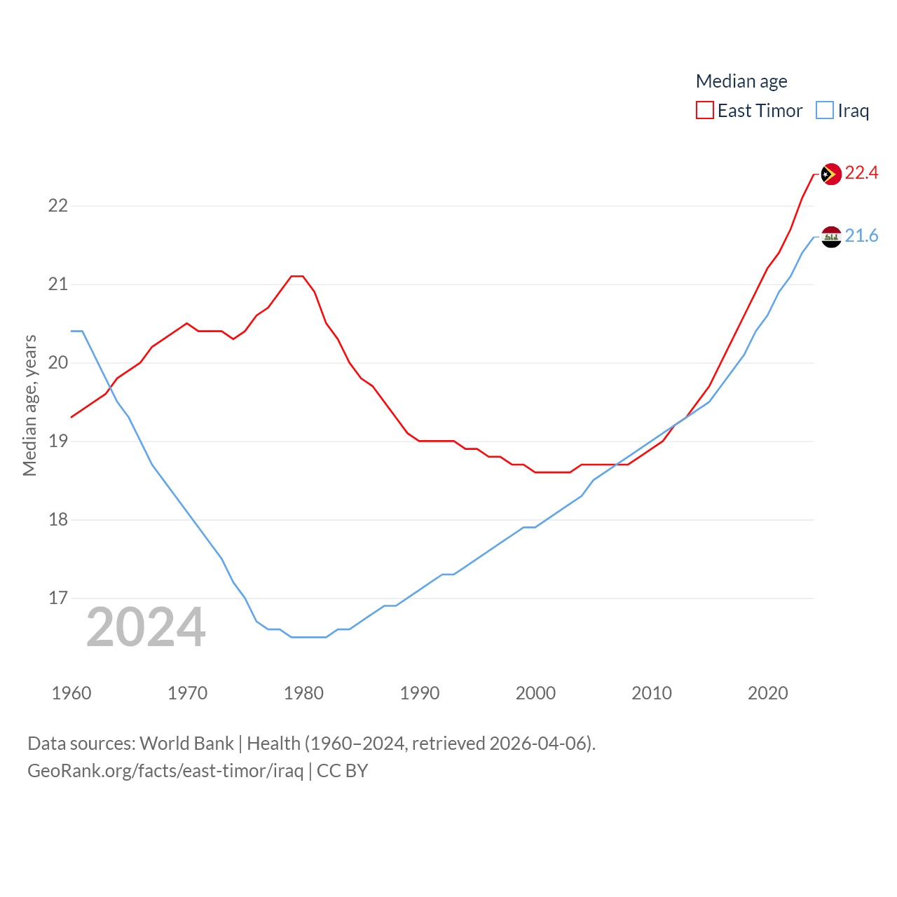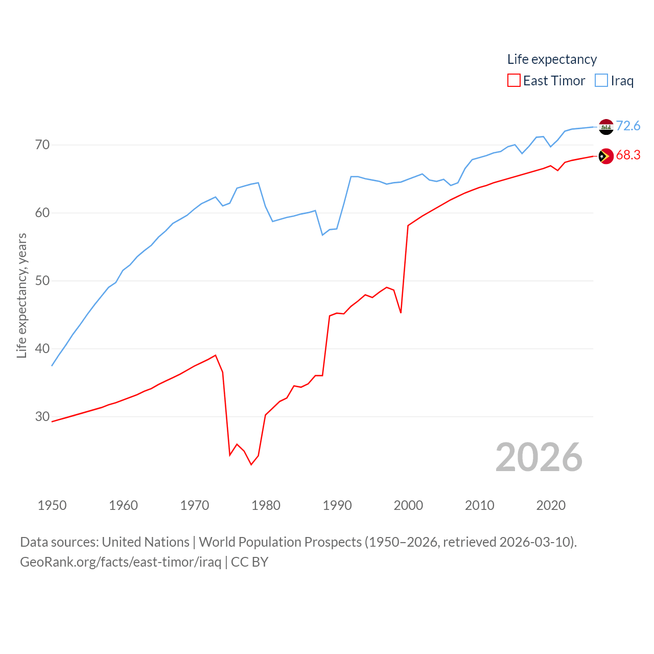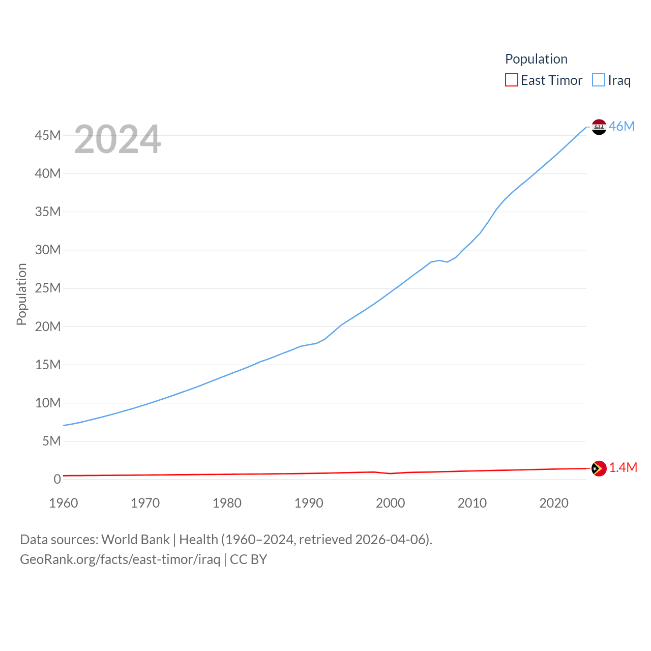 East Timor has a population of 1.4M (ranked 152/197), compared with 46M in Iraq (ranked 34/197). East Timor's land area is 5,741 sq mi versus 167,619 sq mi for Iraq (ranked 155th vs. 57th).