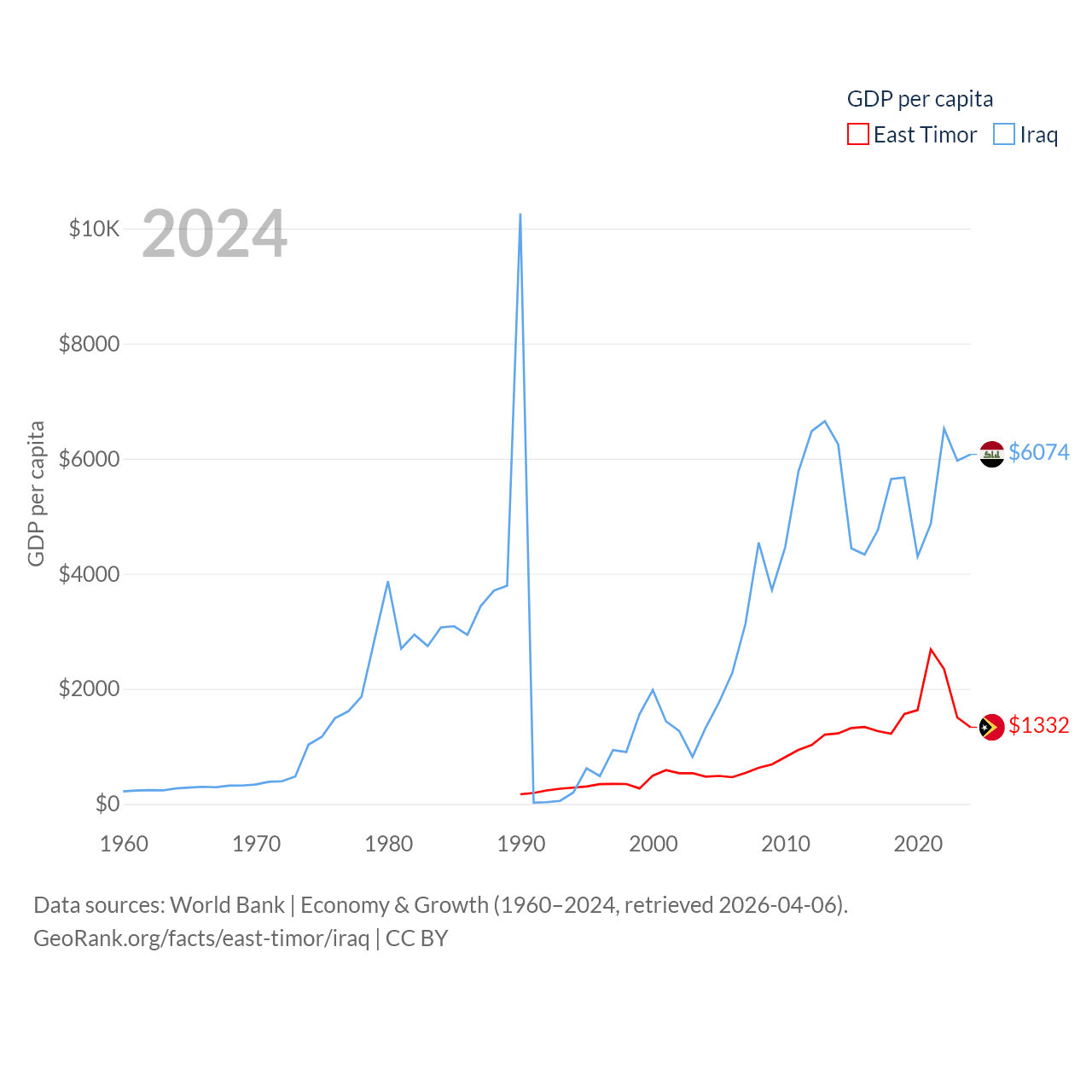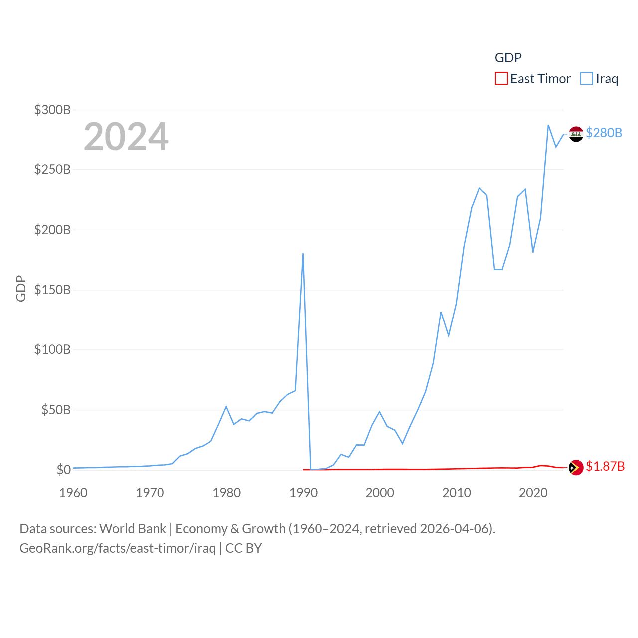 By GDP, East Timor ranks 181/197 ($1.87B) and Iraq ranks 50/197 ($280B). By GDP per capita, East Timor ranks 167/197 ($1,332), while Iraq ranks 113/197 ($6,074).