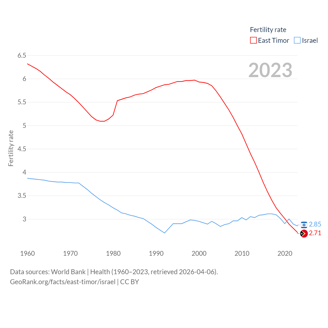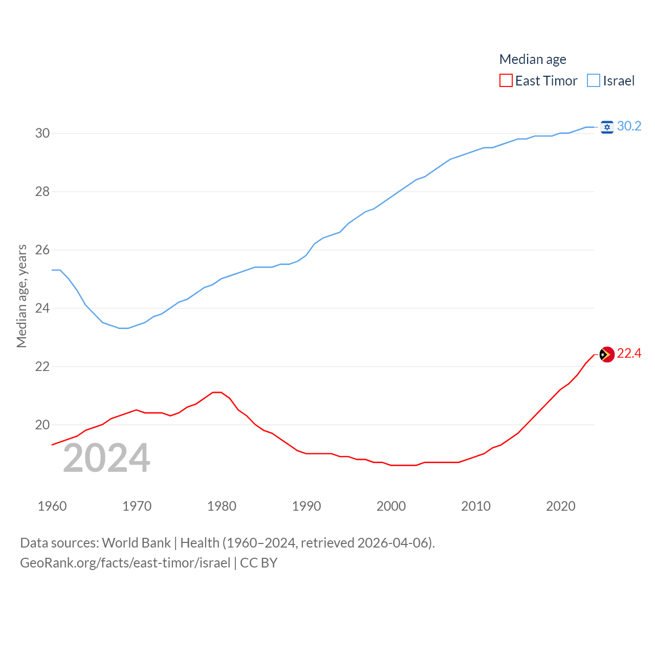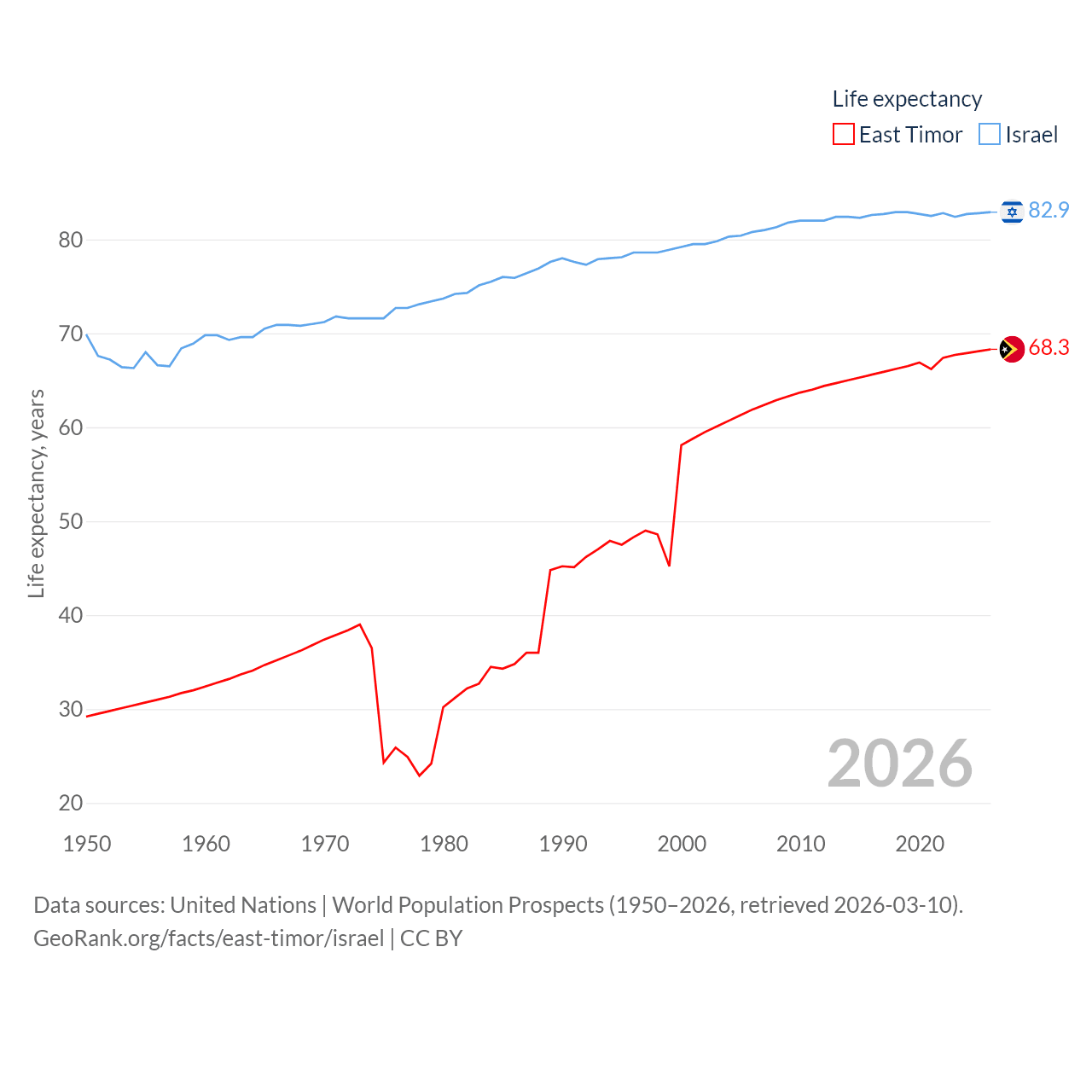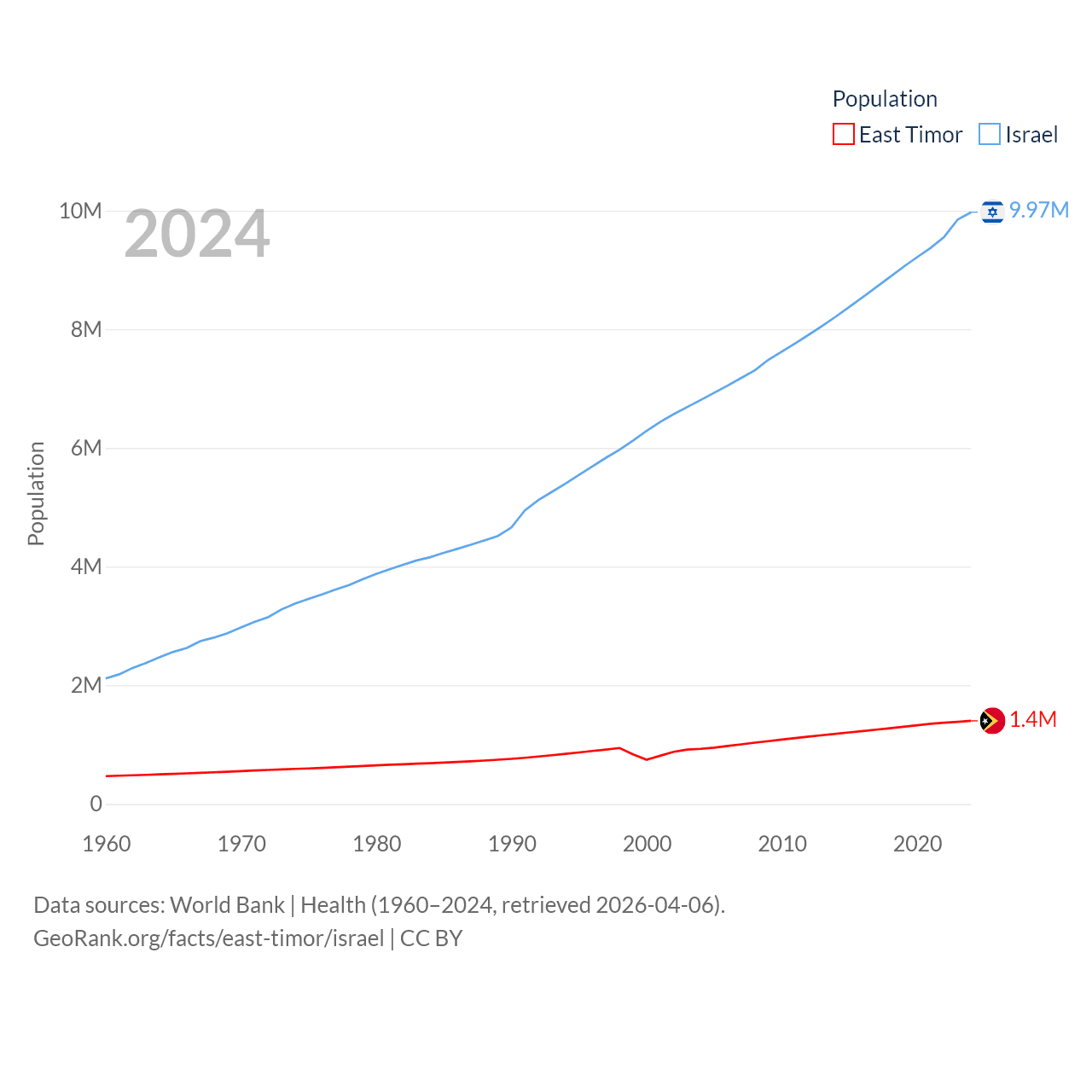 East Timor has a population of 1.4M (ranked 152/197), compared with 9.97M in Israel (ranked 96/197). East Timor's land area is 5,741 sq mi versus 8,355 sq mi for Israel (ranked 155th vs. 149th).
