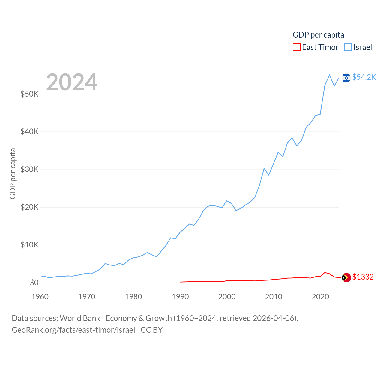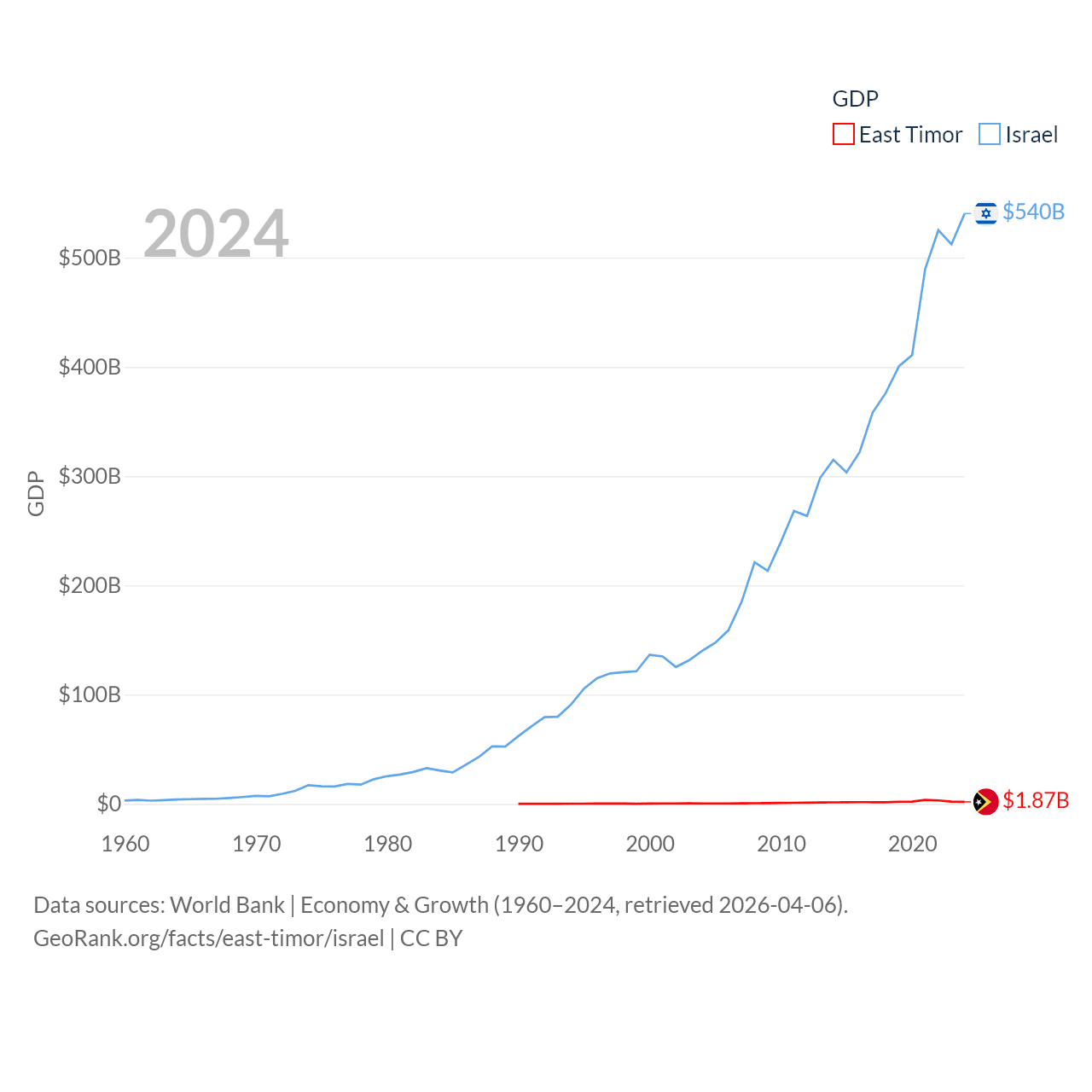 By GDP, East Timor ranks 181/197 ($1.87B) and Israel ranks 29/197 ($540B). By GDP per capita, East Timor ranks 167/197 ($1,332), while Israel ranks 21/197 ($54,177).