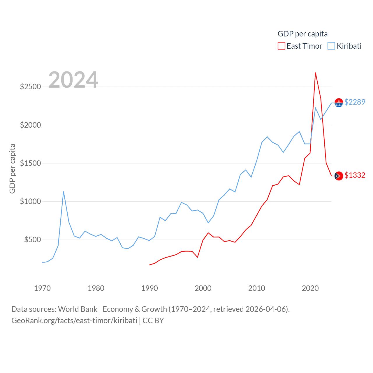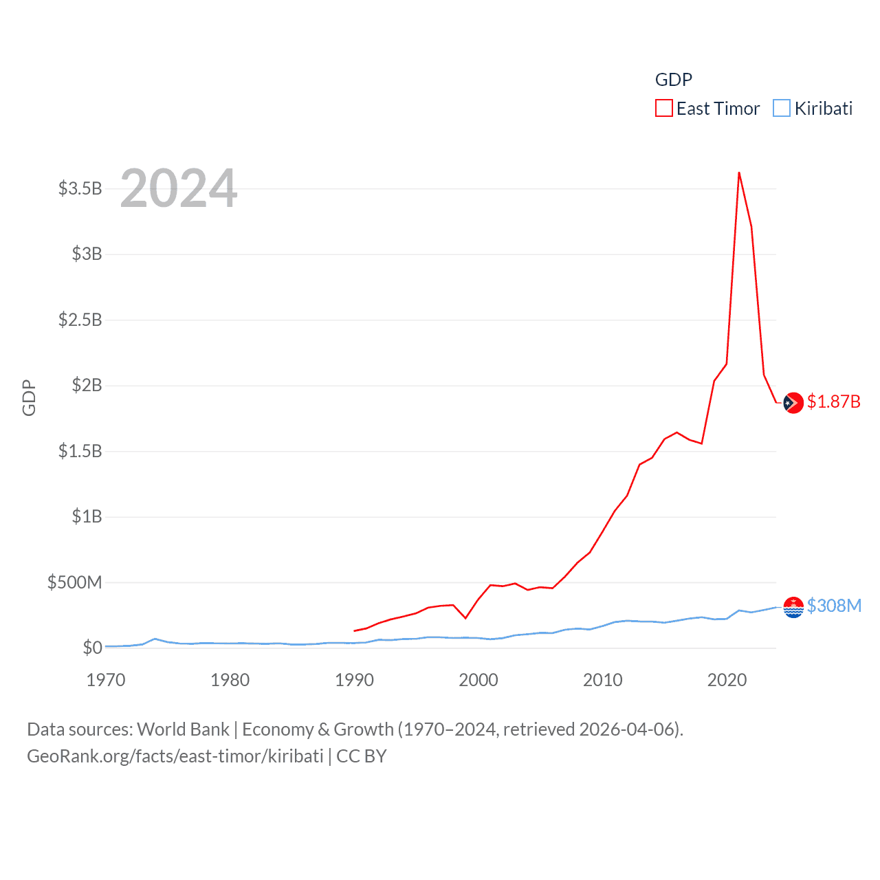 By GDP, East Timor ranks 181/197 ($1.87B) and Kiribati ranks 192/197 ($308M). By GDP per capita, East Timor ranks 167/197 ($1,332), while Kiribati ranks 152/197 ($2,289).