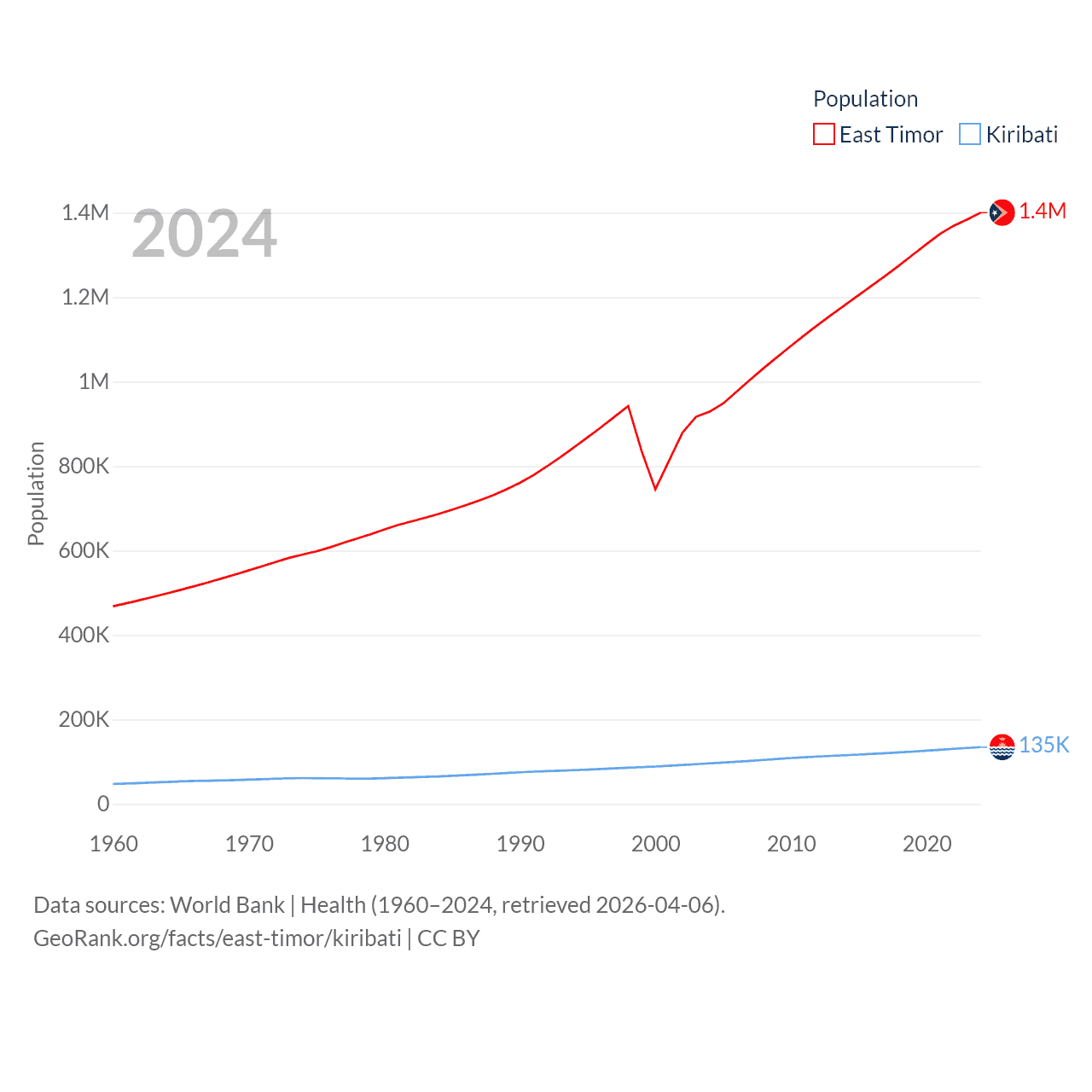 East Timor has a population of 1.4M (ranked 152/197), compared with 135K in Kiribati (ranked 180/197). East Timor's land area is 5,741 sq mi versus 313 sq mi for Kiribati (ranked 155th vs. 173rd).