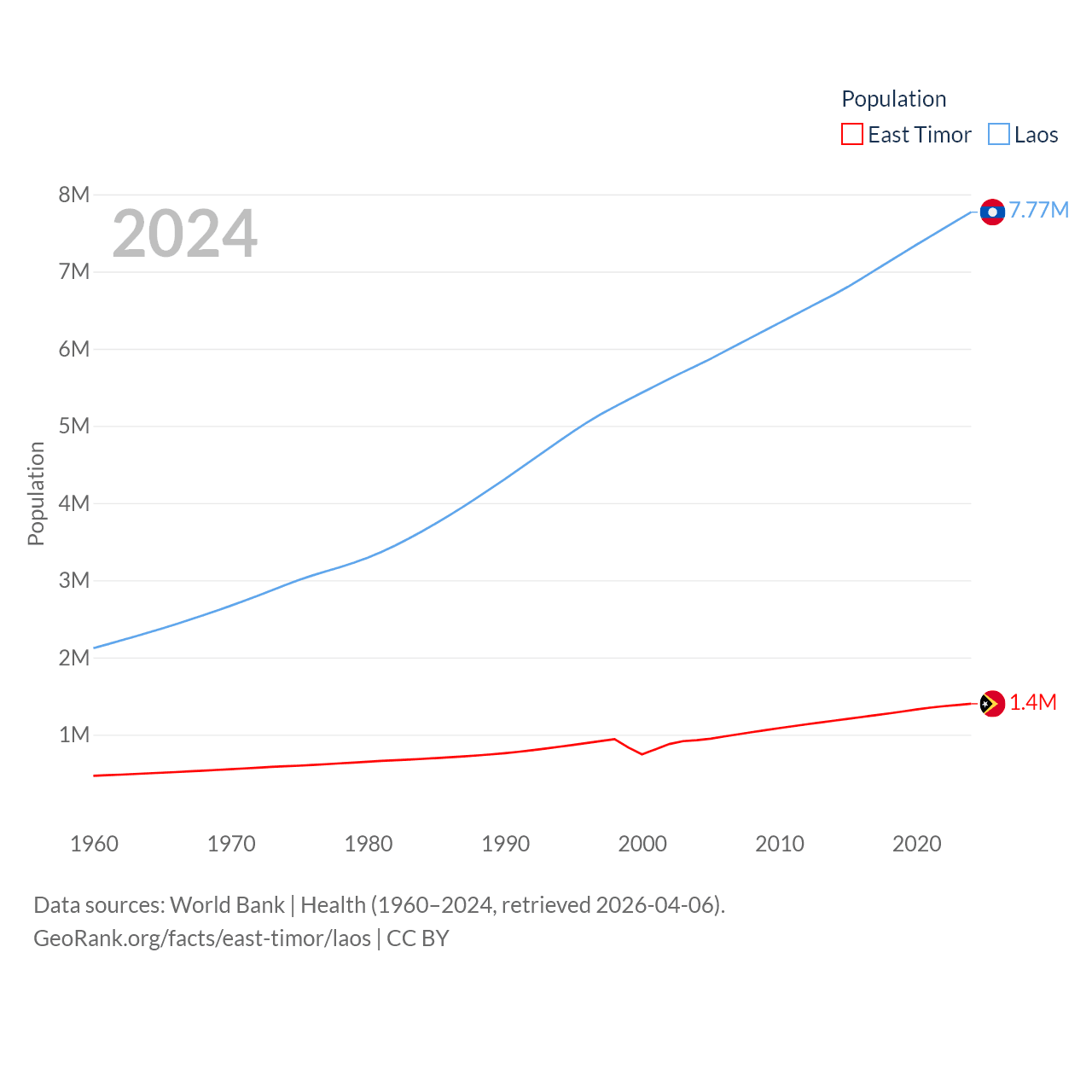 East Timor has a population of 1.4M (ranked 152/197), compared with 7.77M in Laos (ranked 103/197). East Timor's land area is 5,741 sq mi versus 89,112 sq mi for Laos (ranked 155th vs. 79th).