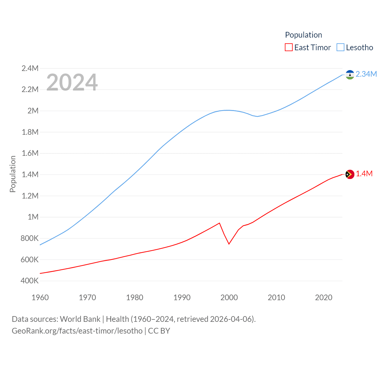 East Timor has a population of 1.4M (ranked 152/197), compared with 2.34M in Lesotho (ranked 145/197). East Timor's land area is 5,741 sq mi versus 11,722 sq mi for Lesotho (ranked 155th vs. 137th).