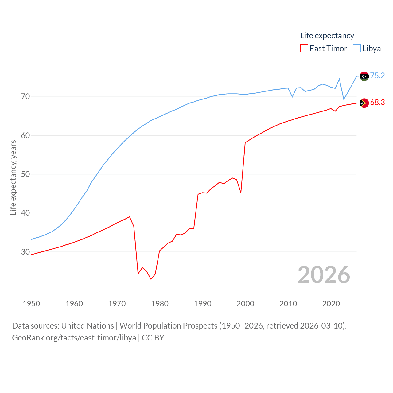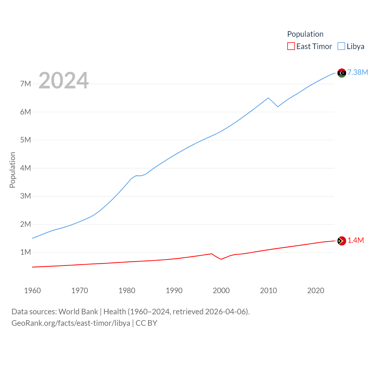 East Timor has a population of 1.4M (ranked 152/197), compared with 7.38M in Libya (ranked 105/197). East Timor's land area is 5,741 sq mi versus 679,362 sq mi for Libya (ranked 155th vs. 16th).