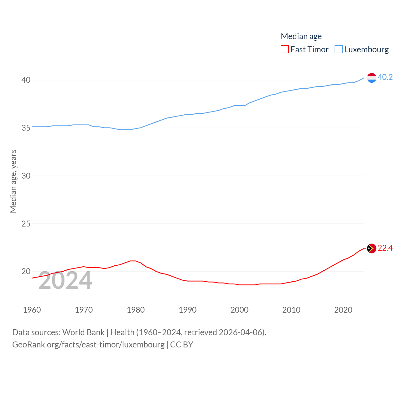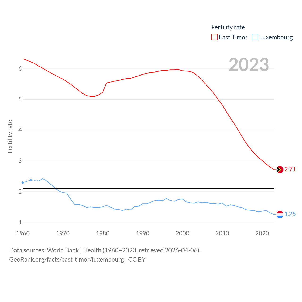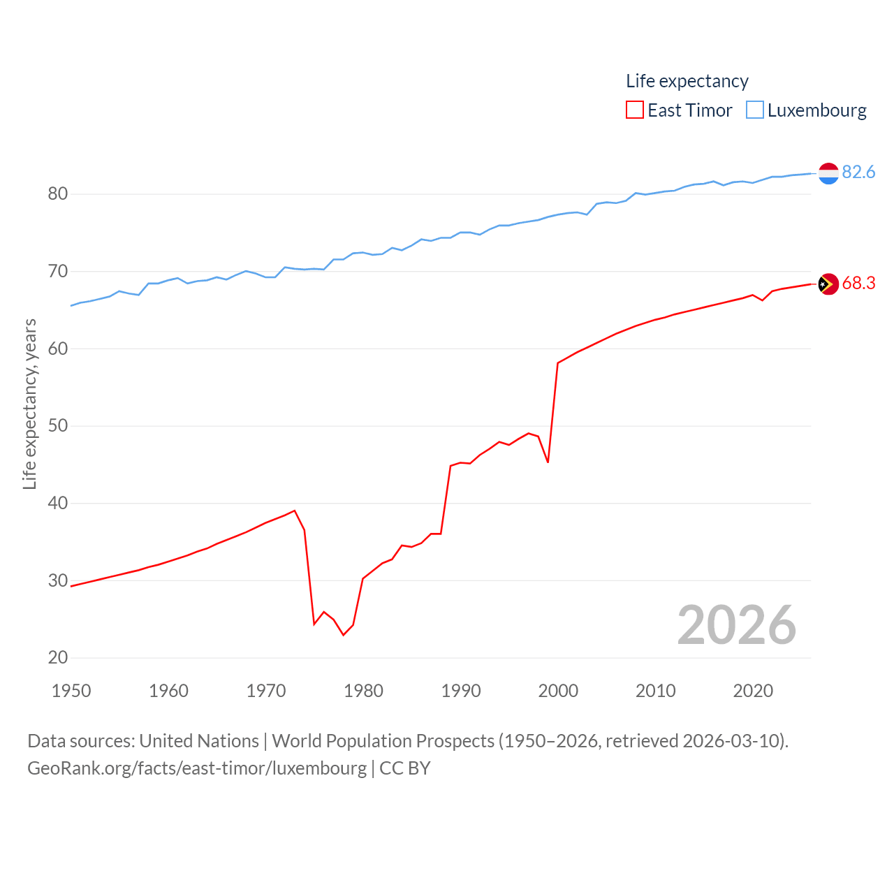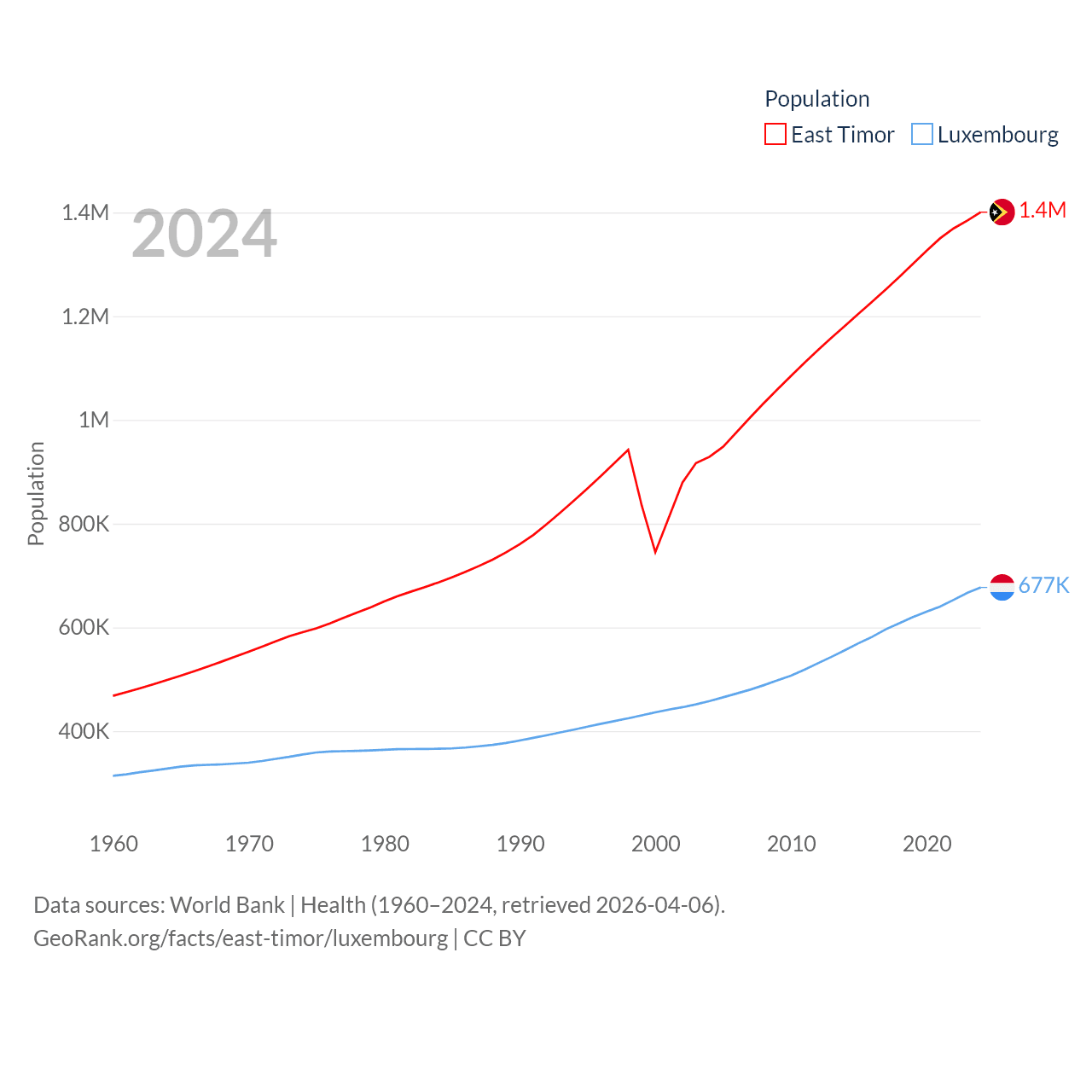 East Timor has a population of 1.4M (ranked 152/197), compared with 677K in Luxembourg (ranked 164/197). East Timor's land area is 5,741 sq mi versus 994 sq mi for Luxembourg (ranked 155th vs. 169th).