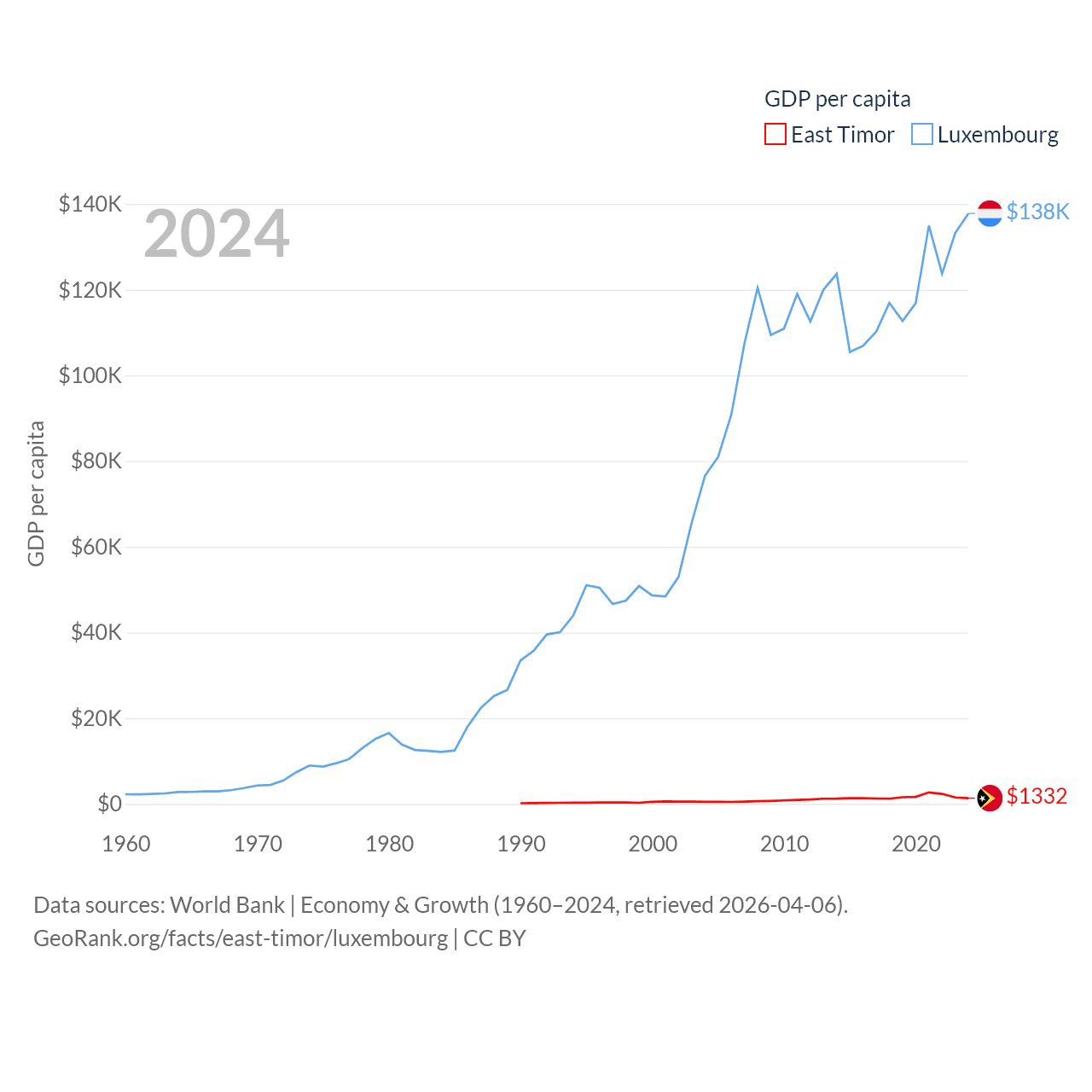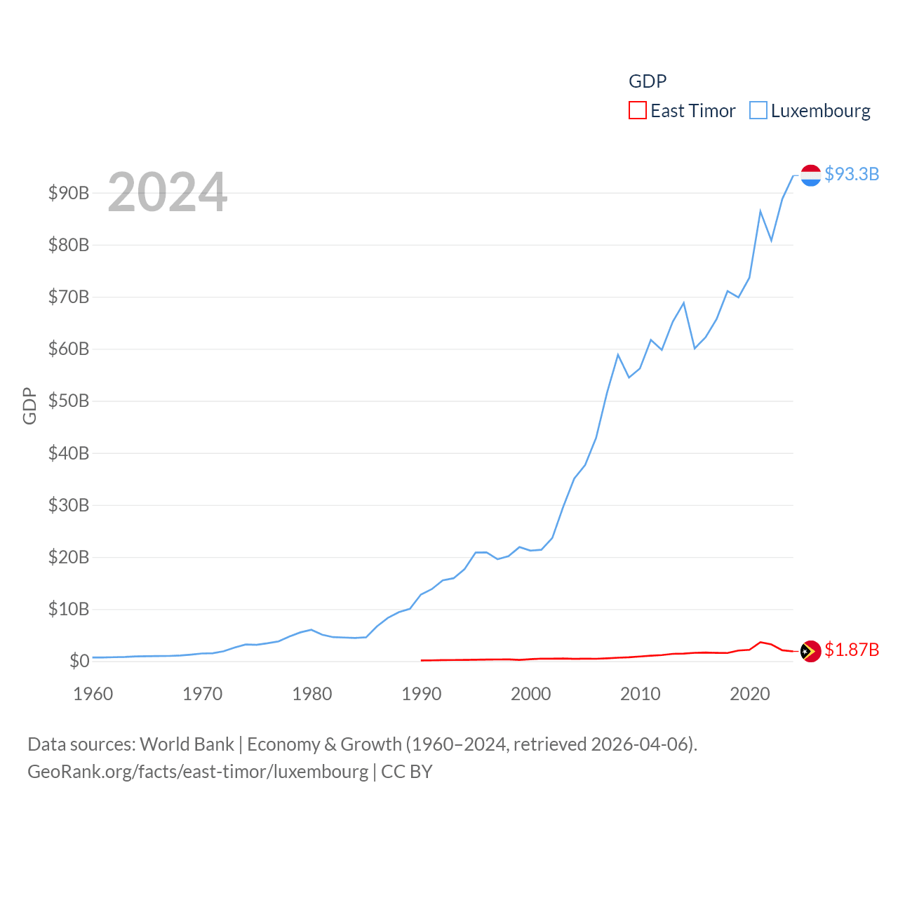 By GDP, East Timor ranks 181/197 ($1.87B) and Luxembourg ranks 74/197 ($93.3B). By GDP per capita, East Timor ranks 167/197 ($1,332), while Luxembourg ranks 3/197 ($137,782).