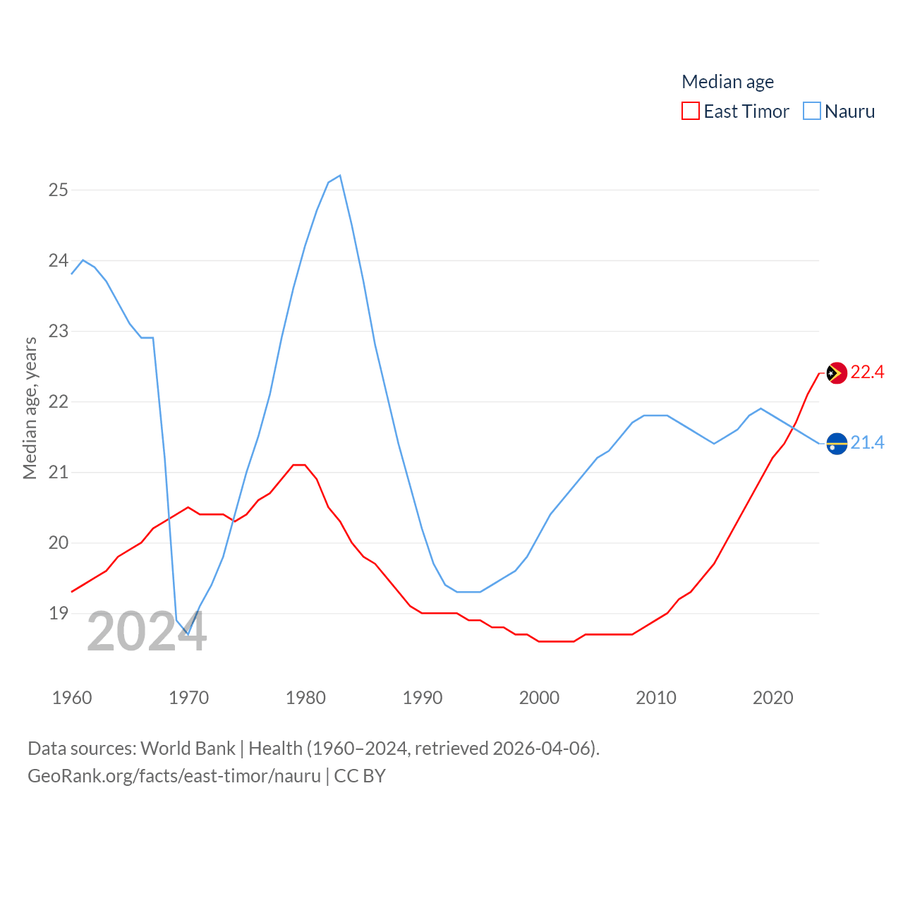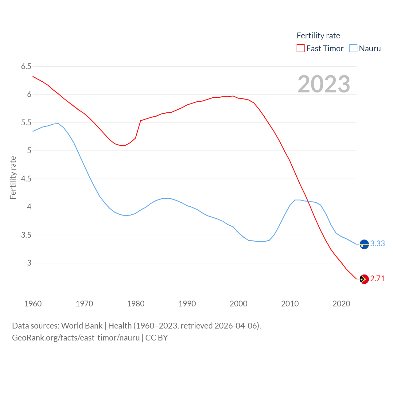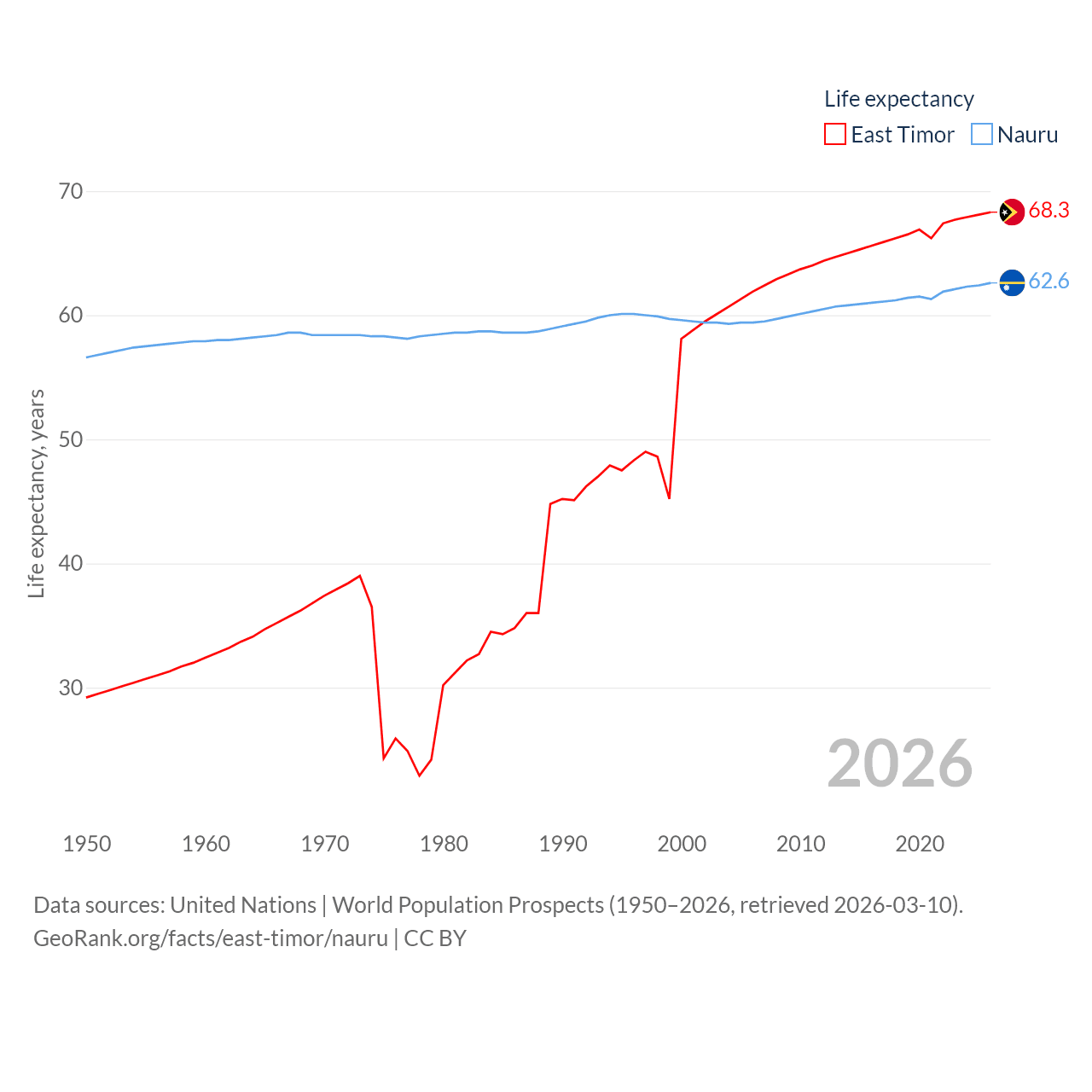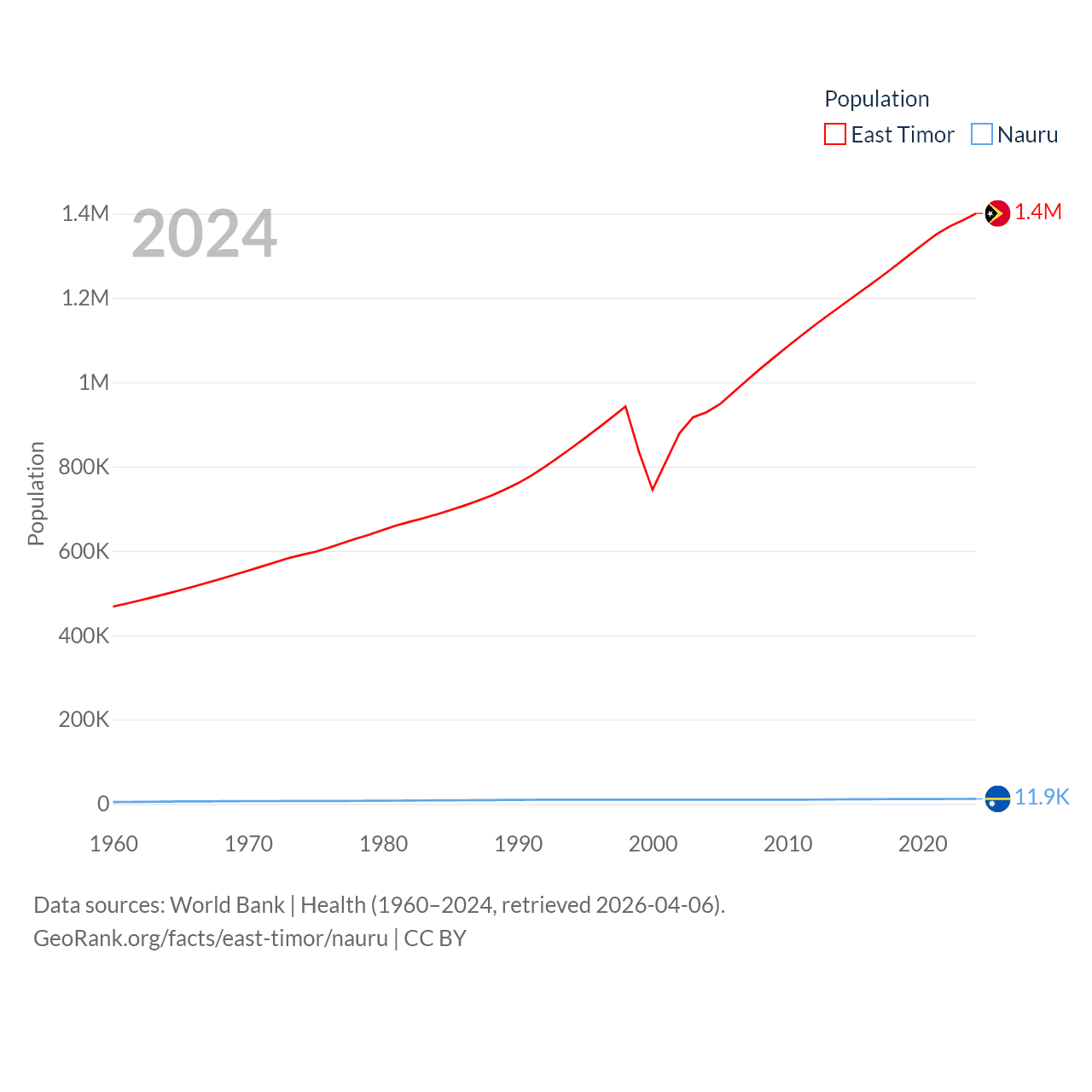 East Timor has a population of 1.4M (ranked 152/197), compared with 11.9K in Nauru (ranked 195/197). East Timor's land area is 5,741 sq mi versus 7.72 sq mi for Nauru (ranked 155th vs. 195th).