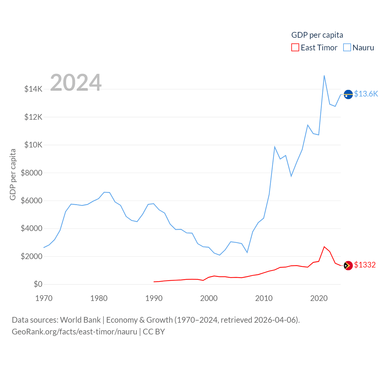 By GDP, East Timor ranks 181/197 ($1.87B) and Nauru ranks 195/197 ($163M). By GDP per capita, East Timor ranks 167/197 ($1,332), while Nauru ranks 74/197 ($13,609).