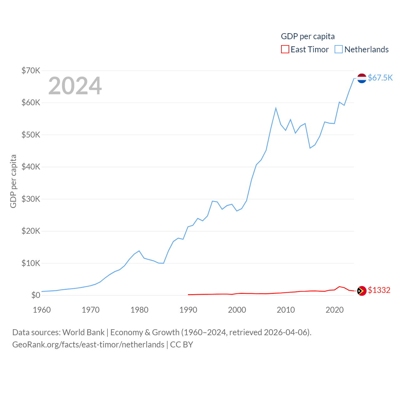 By GDP, East Timor ranks 181/197 ($1.87B) and The Netherlands ranks 19/197 ($1.21T). By GDP per capita, East Timor ranks 167/197 ($1,332), while The Netherlands ranks 13/197 ($67,520).