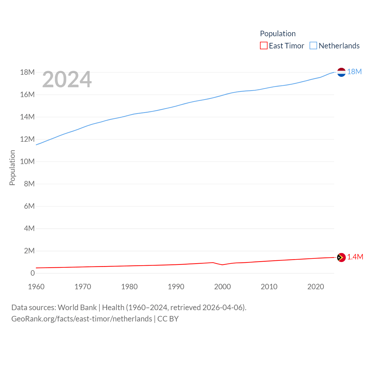 East Timor has a population of 1.4M (ranked 152/197), compared with 18M in The Netherlands (ranked 72/197). East Timor's land area is 5,741 sq mi versus 13,000 sq mi for The Netherlands (ranked 155th vs. 134th).