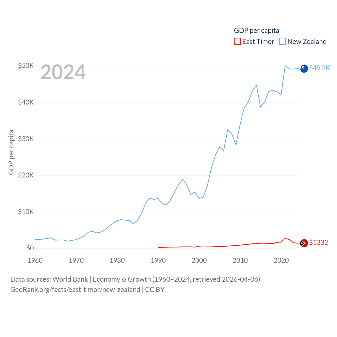 By GDP, East Timor ranks 181/197 ($1.87B) and New Zealand ranks 52/197 ($260B). By GDP per capita, East Timor ranks 167/197 ($1,332), while New Zealand ranks 26/197 ($49,205).