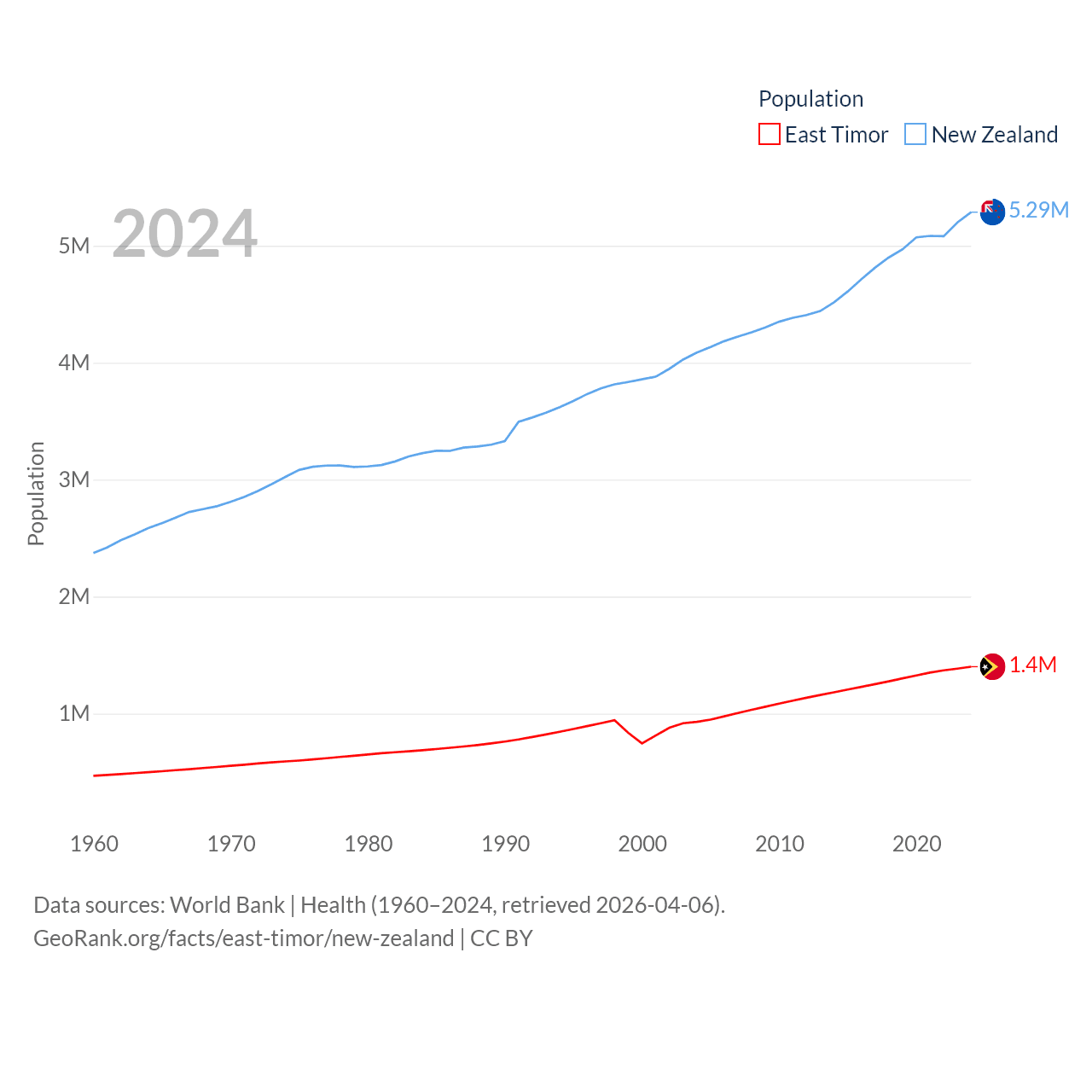 East Timor has a population of 1.4M (ranked 152/197), compared with 5.29M in New Zealand (ranked 123/197). East Timor's land area is 5,741 sq mi versus 101,665 sq mi for New Zealand (ranked 155th vs. 74th).