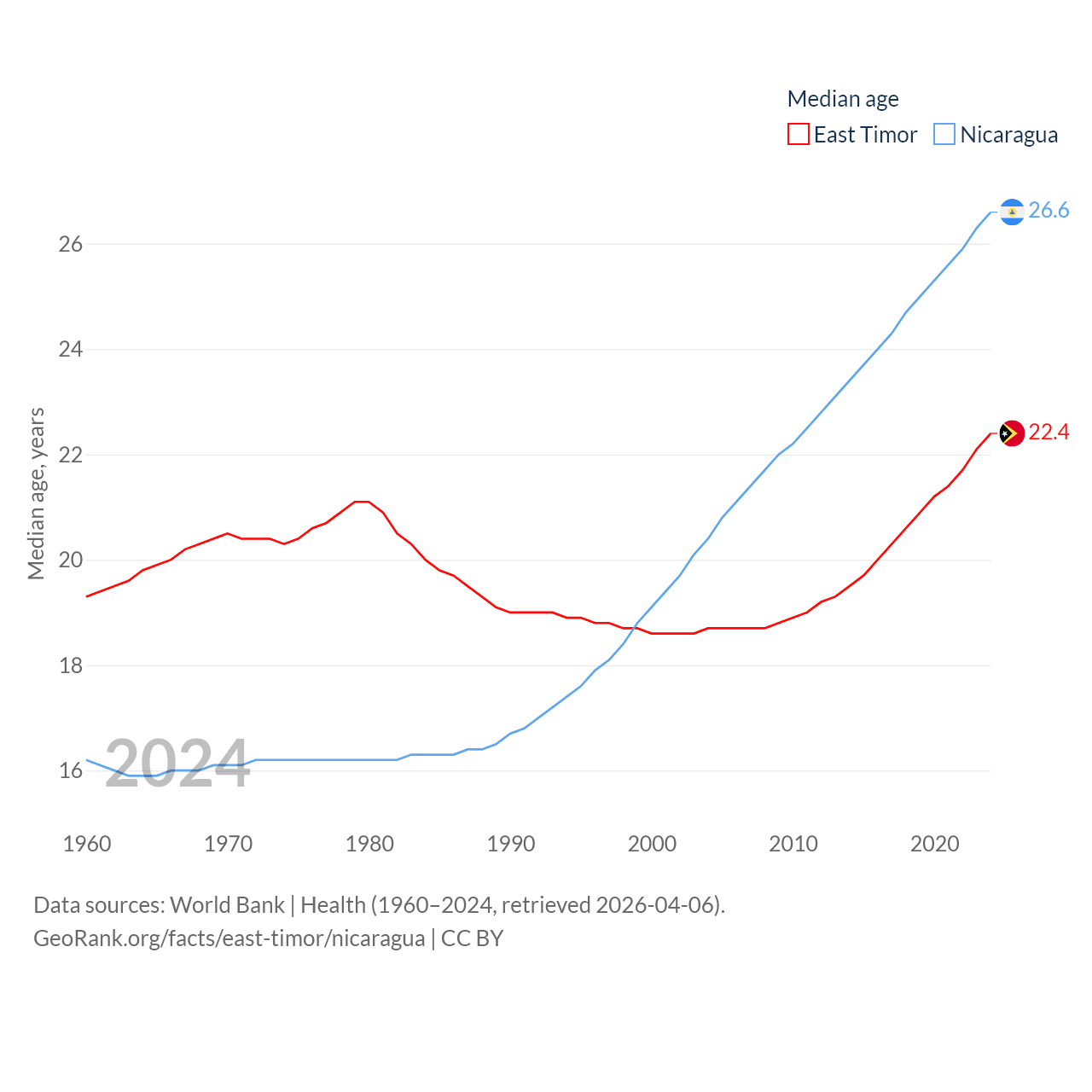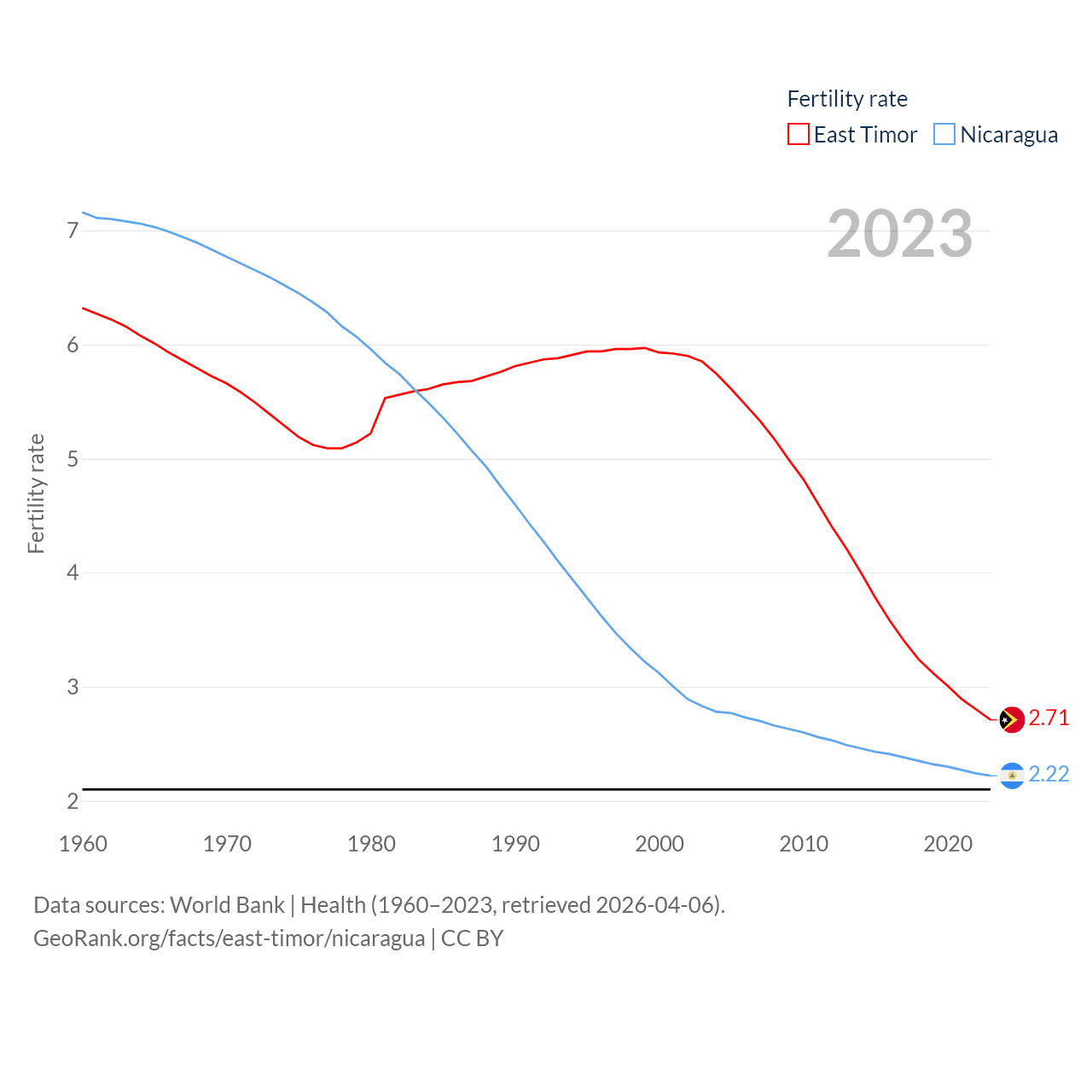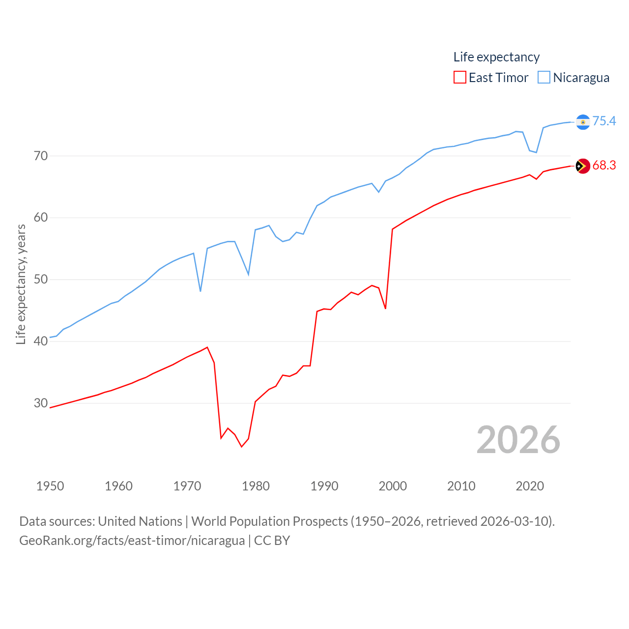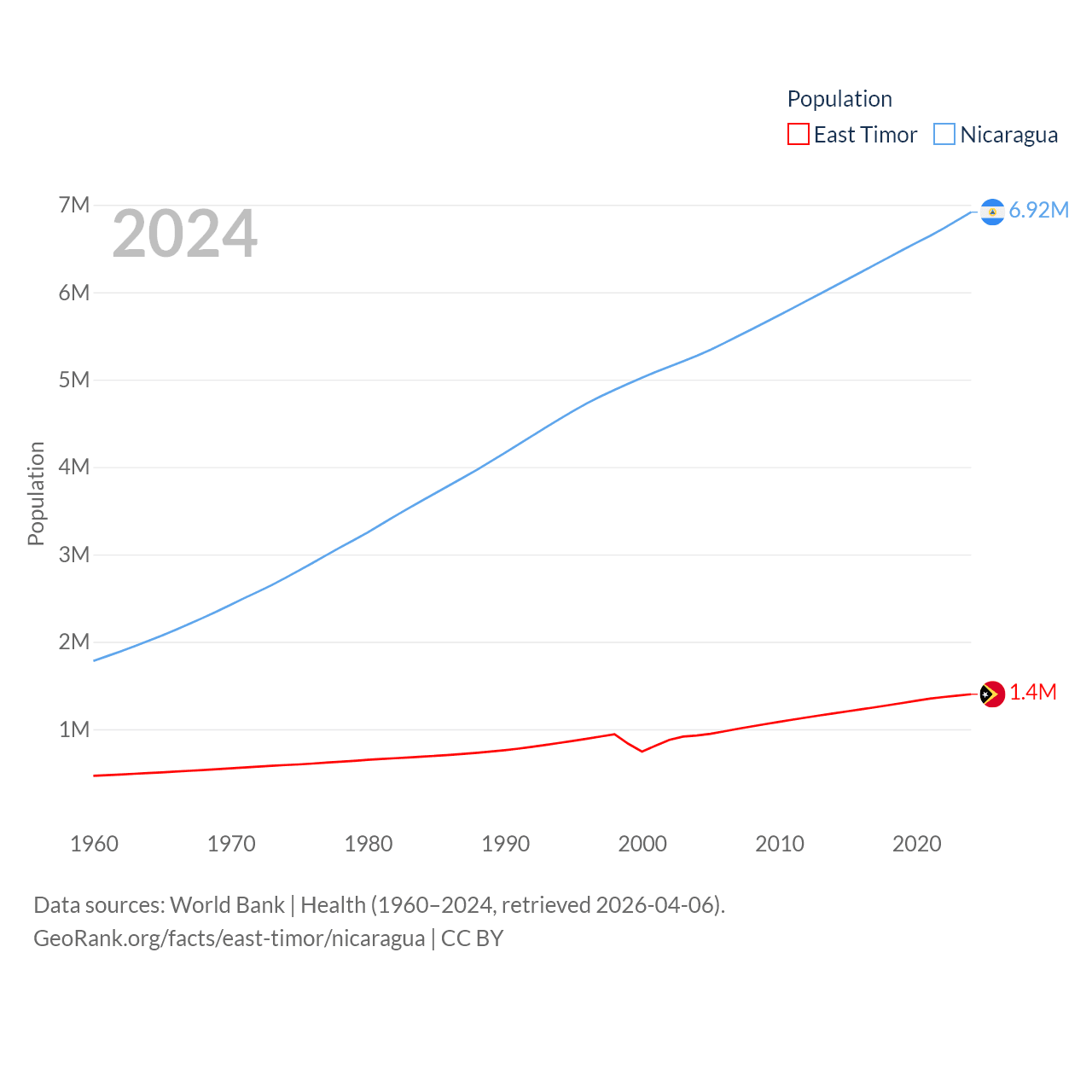 East Timor has a population of 1.4M (ranked 152/197), compared with 6.92M in Nicaragua (ranked 108/197). East Timor's land area is 5,741 sq mi versus 46,464 sq mi for Nicaragua (ranked 155th vs. 98th).
