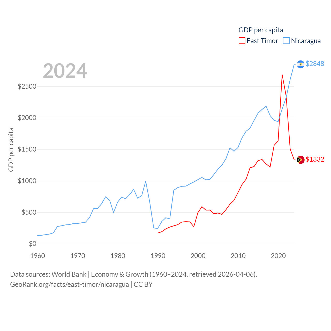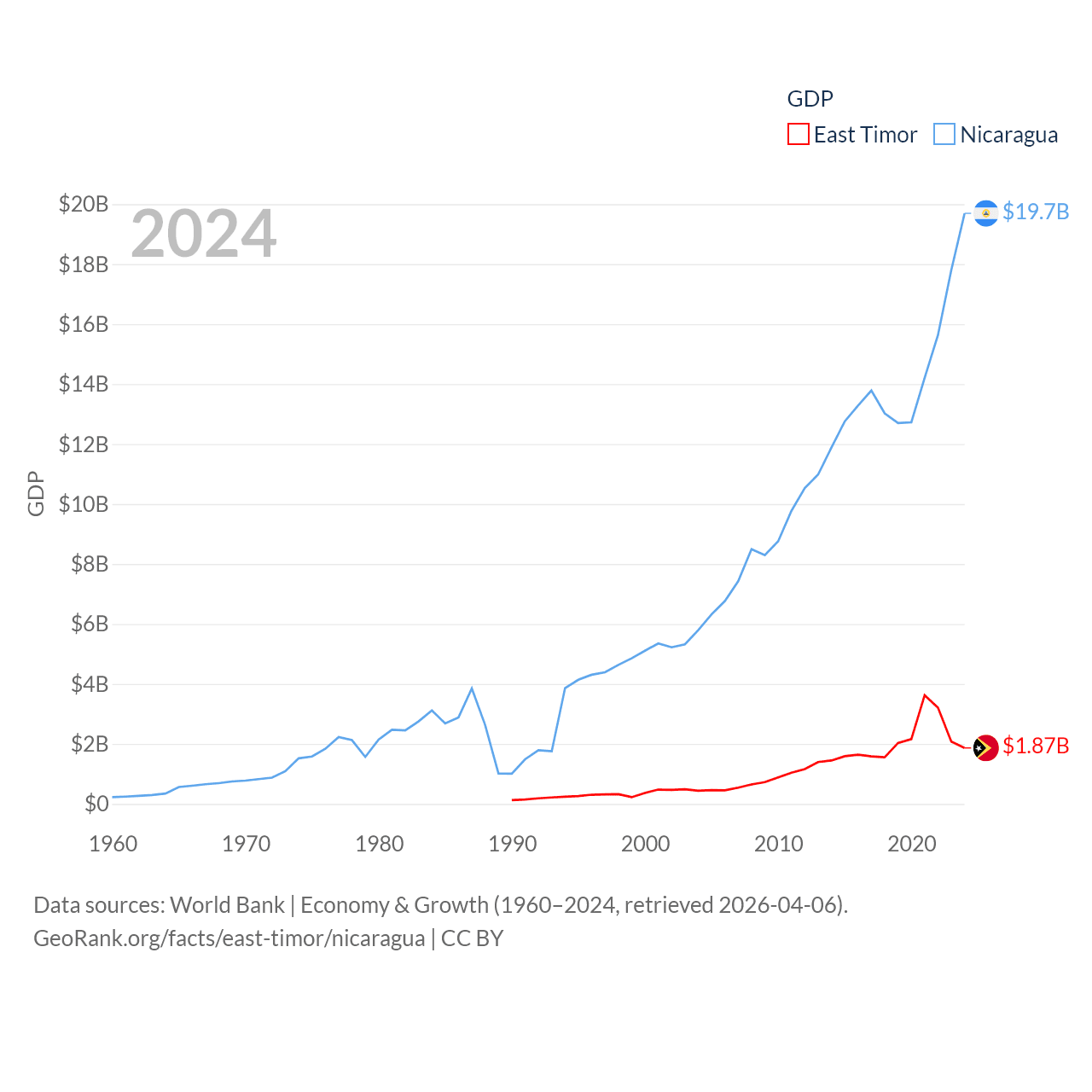 By GDP, East Timor ranks 181/197 ($1.87B) and Nicaragua ranks 131/197 ($19.7B). By GDP per capita, East Timor ranks 167/197 ($1,332), while Nicaragua ranks 141/197 ($2,848).