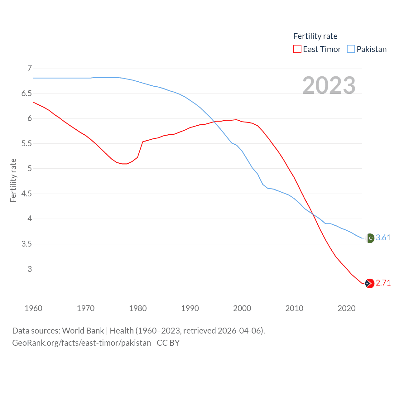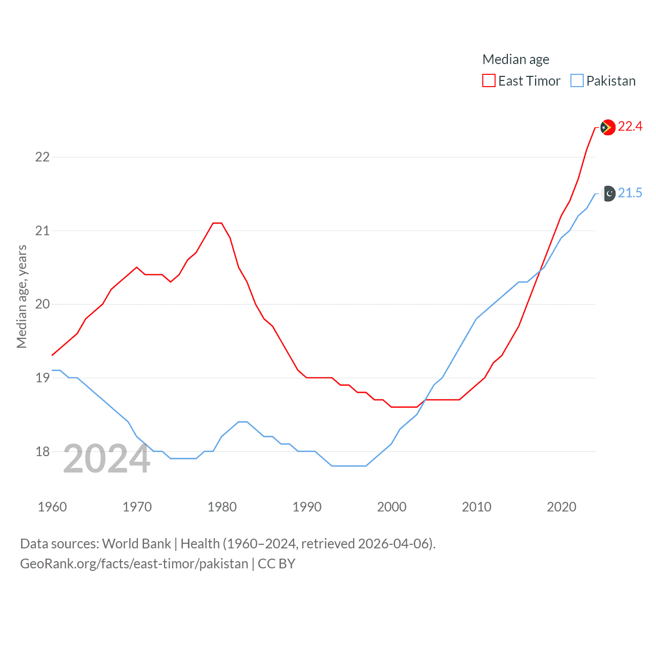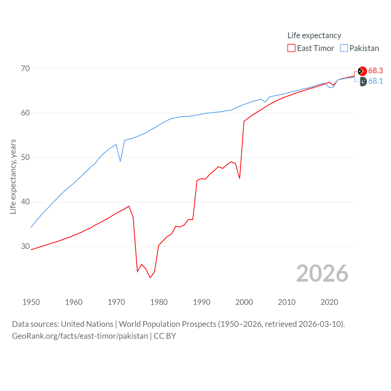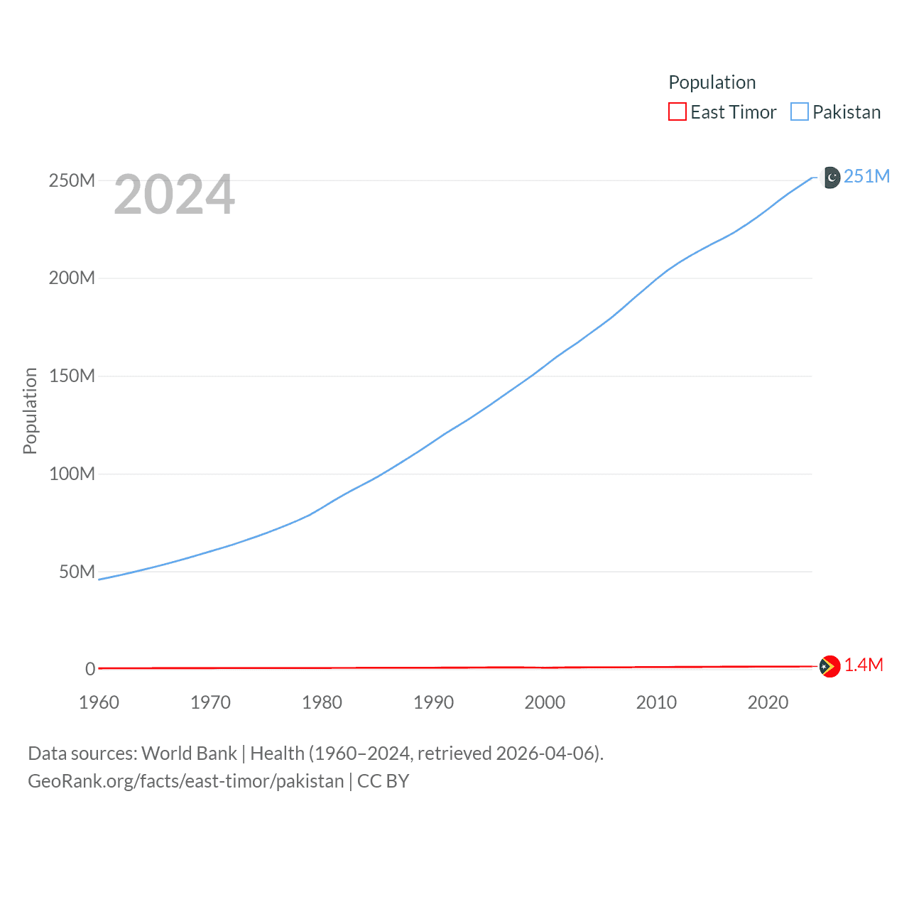 East Timor has a population of 1.4M (ranked 152/197), compared with 251M in Pakistan (ranked 5/197). East Timor's land area is 5,741 sq mi versus 297,638 sq mi for Pakistan (ranked 155th vs. 35th).