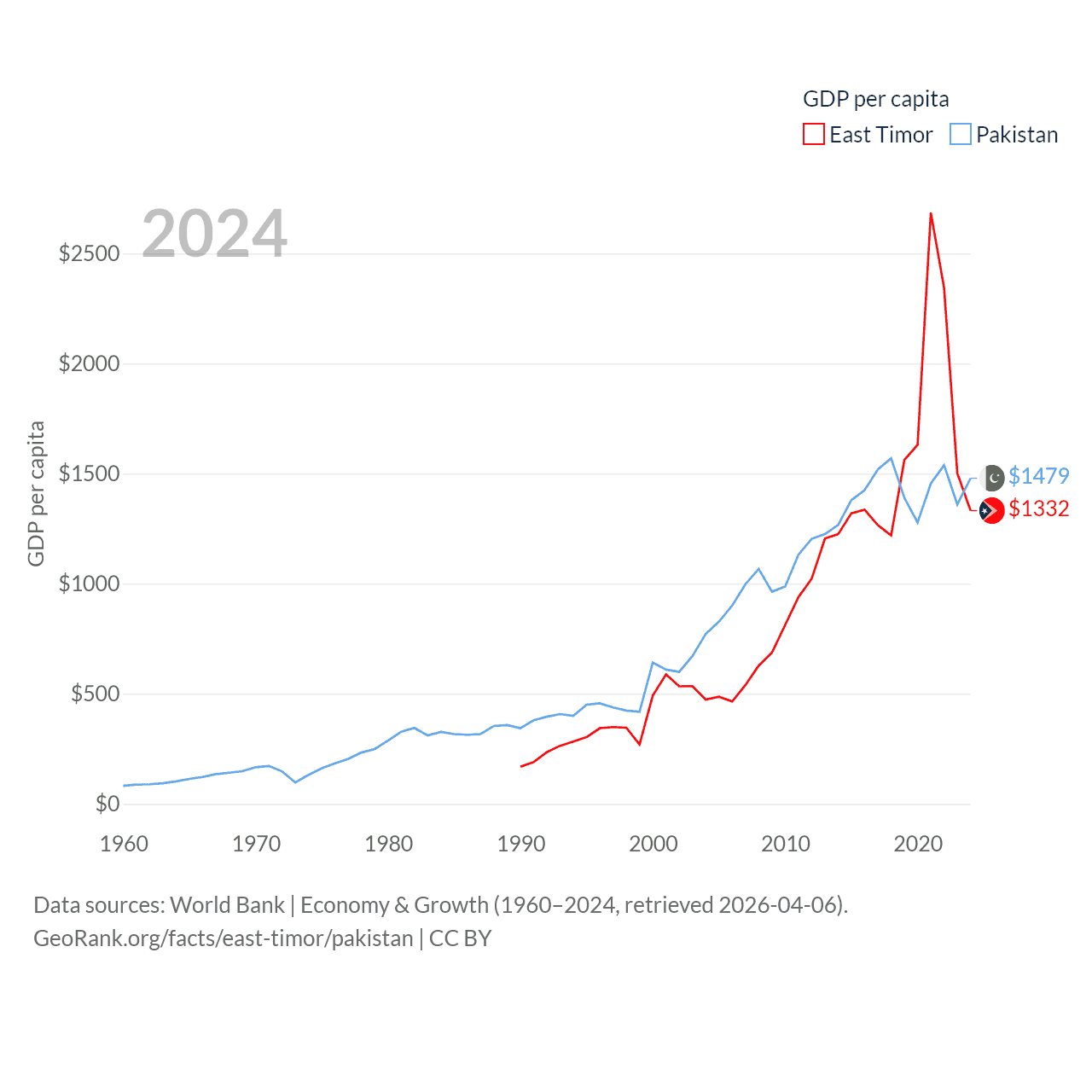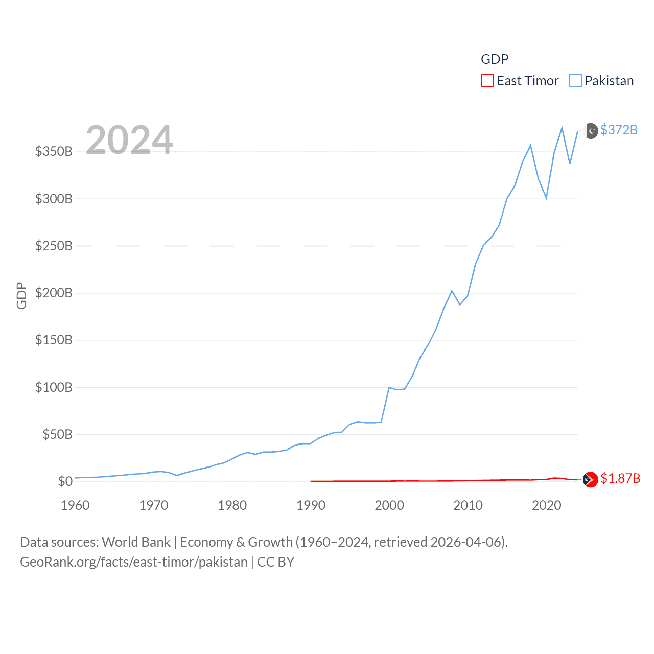 By GDP, East Timor ranks 181/197 ($1.87B) and Pakistan ranks 43/197 ($372B). By GDP per capita, East Timor ranks 167/197 ($1,332), while Pakistan ranks 163/197 ($1,479).